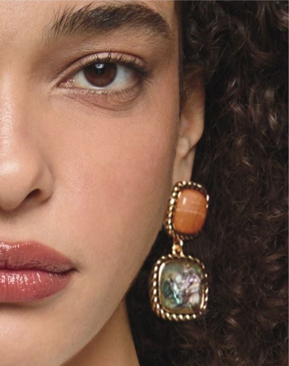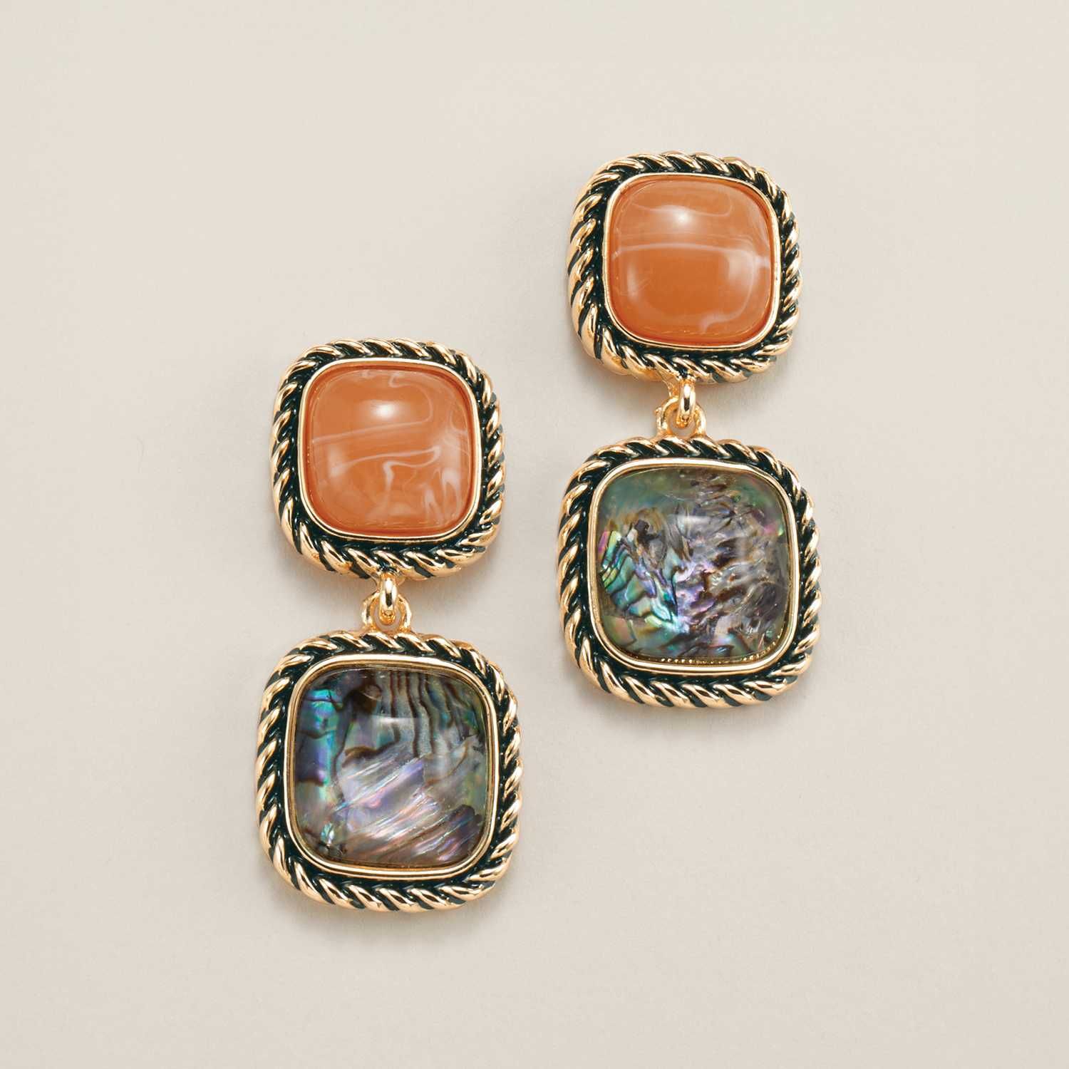 Twin drops of colored abalone and orange gem-like stones are whimsically elegant. This distinctive pair is set in antiqued goldtone, making it a timelessly versatile addition to your jewelry collection. Imported.