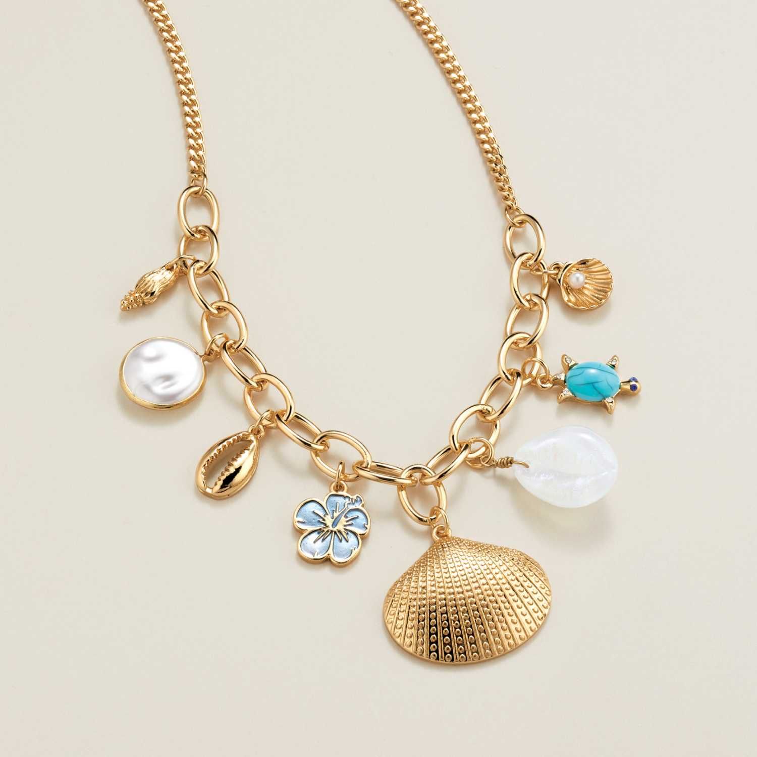 Add a playful touch of seaside charm to your look. A myriad of sea-inspired symbols dangle from a lustrous gold-tone link chain— the perfect accessory for a beachside look.