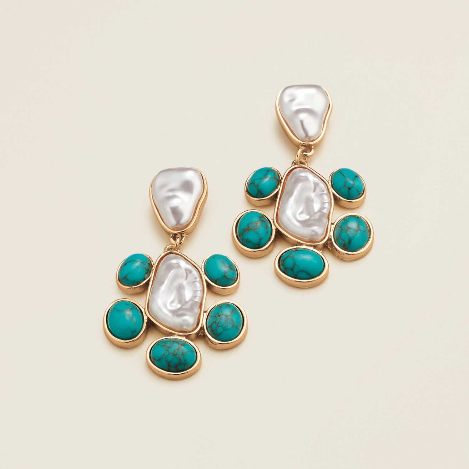 Dazzling drop earrings combine eye-catching reconstituted turquoise and pearl-like stones with goldtone for an ethereal look that will upgrade any ensemble.