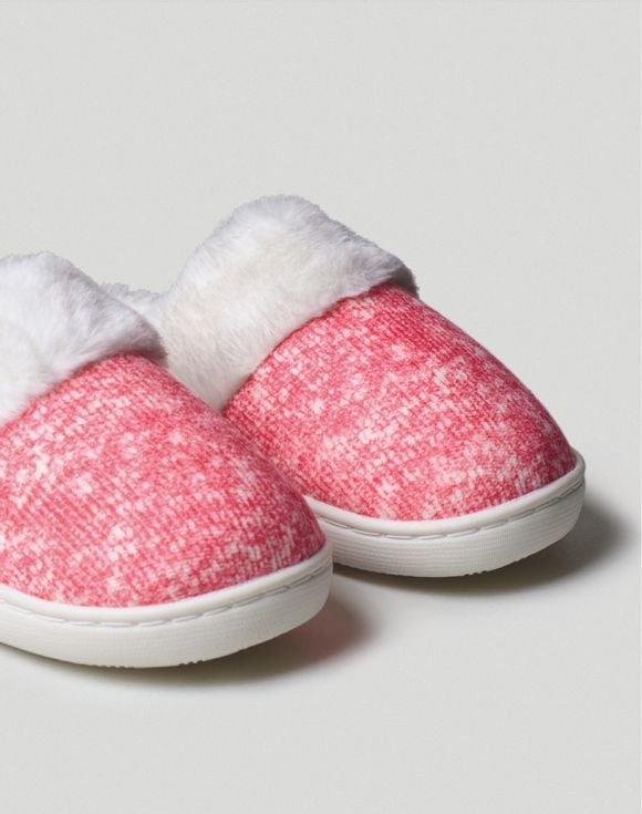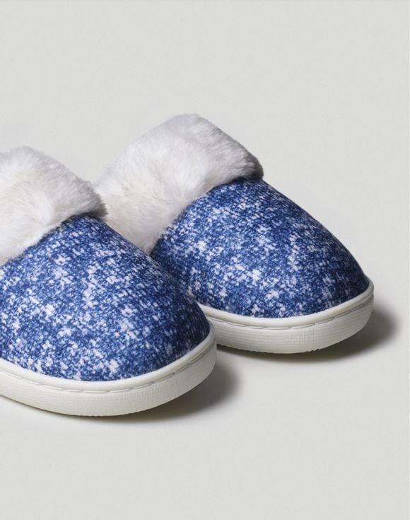 Keep toes toasty and stylish in space-dyed slippers. Choose from blue or red with ivory faux fur trim and lining. Imported.