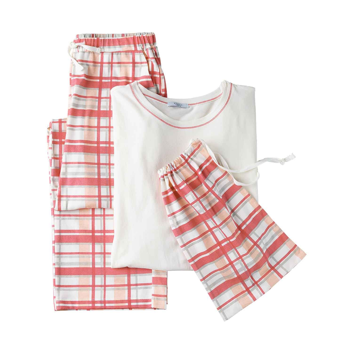 Made for cozy nights in, this two-piece pajama set will become a bedtime favorite for your guy. The set includes a solid ivory crewneck top with short sleeves featuring contrast overlock stitching, and plaid bottoms with side seam pockets and drawstring waist. It comes in a plaid drawstring bag which makes it ideal for gifting. Center back length: 29" on L. Inseam: 30" on all sizes. Imported.