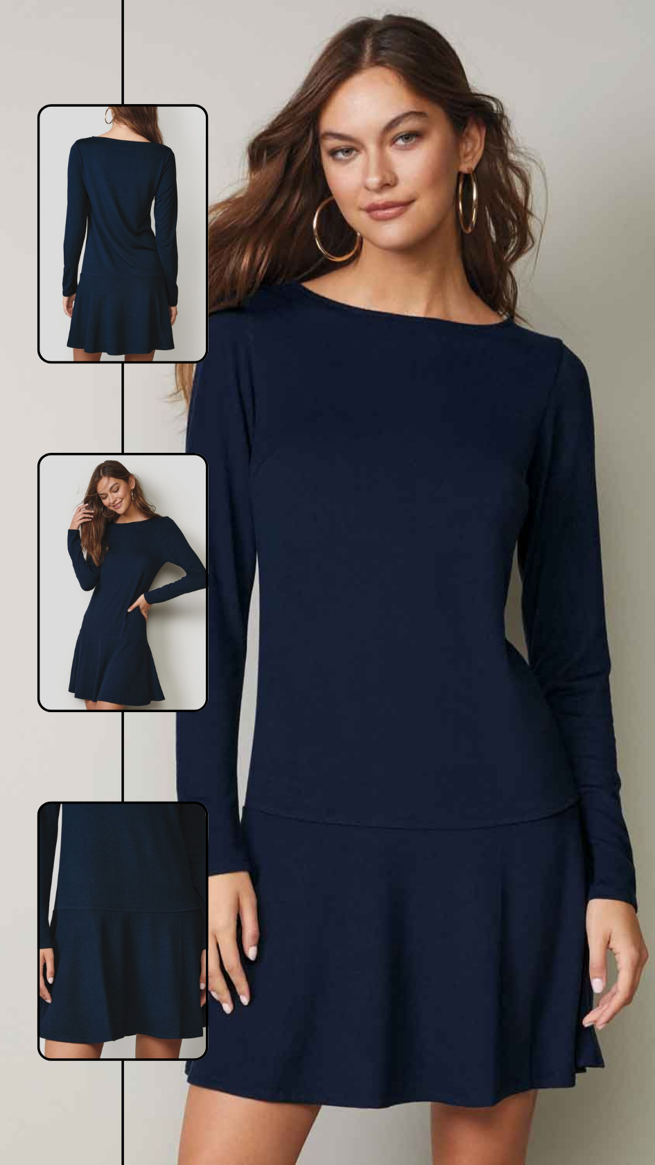 Meet your new LBD — Little Blue Dress! Midnight navy puts a pretty twist on a wardrobe essential you’ll reach for again and again. All-occasion soft knit dress features a round neckline and a flattering fit with drop waist and flared skirt panel. Center back length: 34 1⁄2" on M; 36"on 1X. Imported.