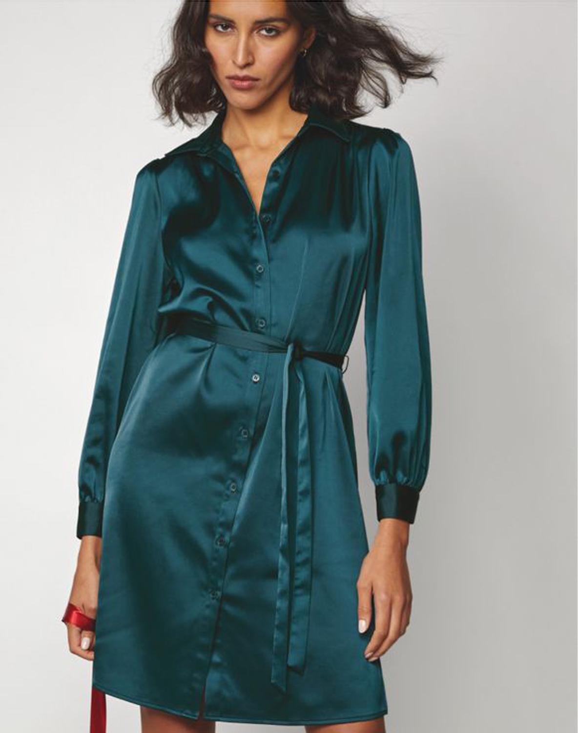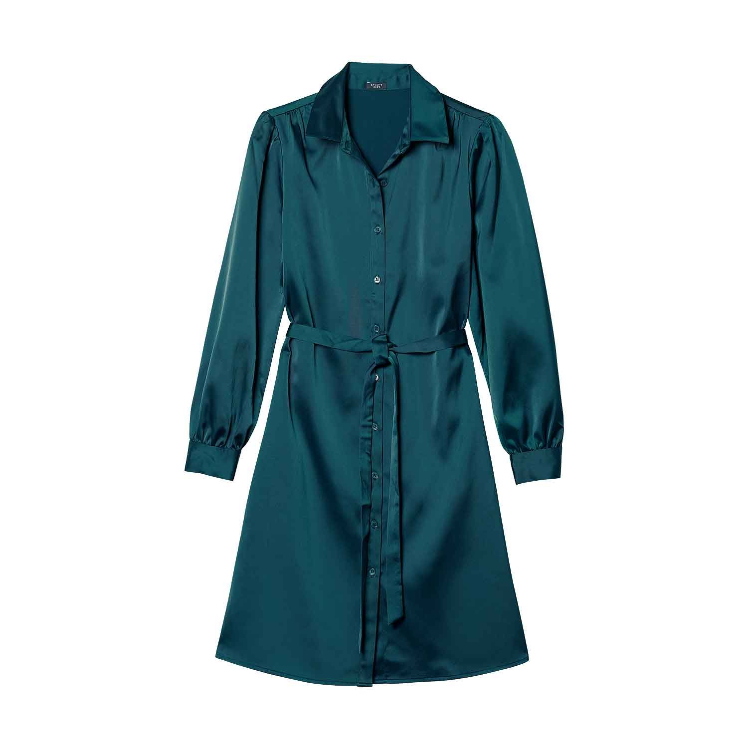 Feather-weight satin flows like liquid over your silhouette in this classic button-front style dress. A jewel-tone deep teal shade and self-tie sash at waist add sophisticated appeal to this dressy look. Center back length: 38" on M; 39" on 1X. Imported.