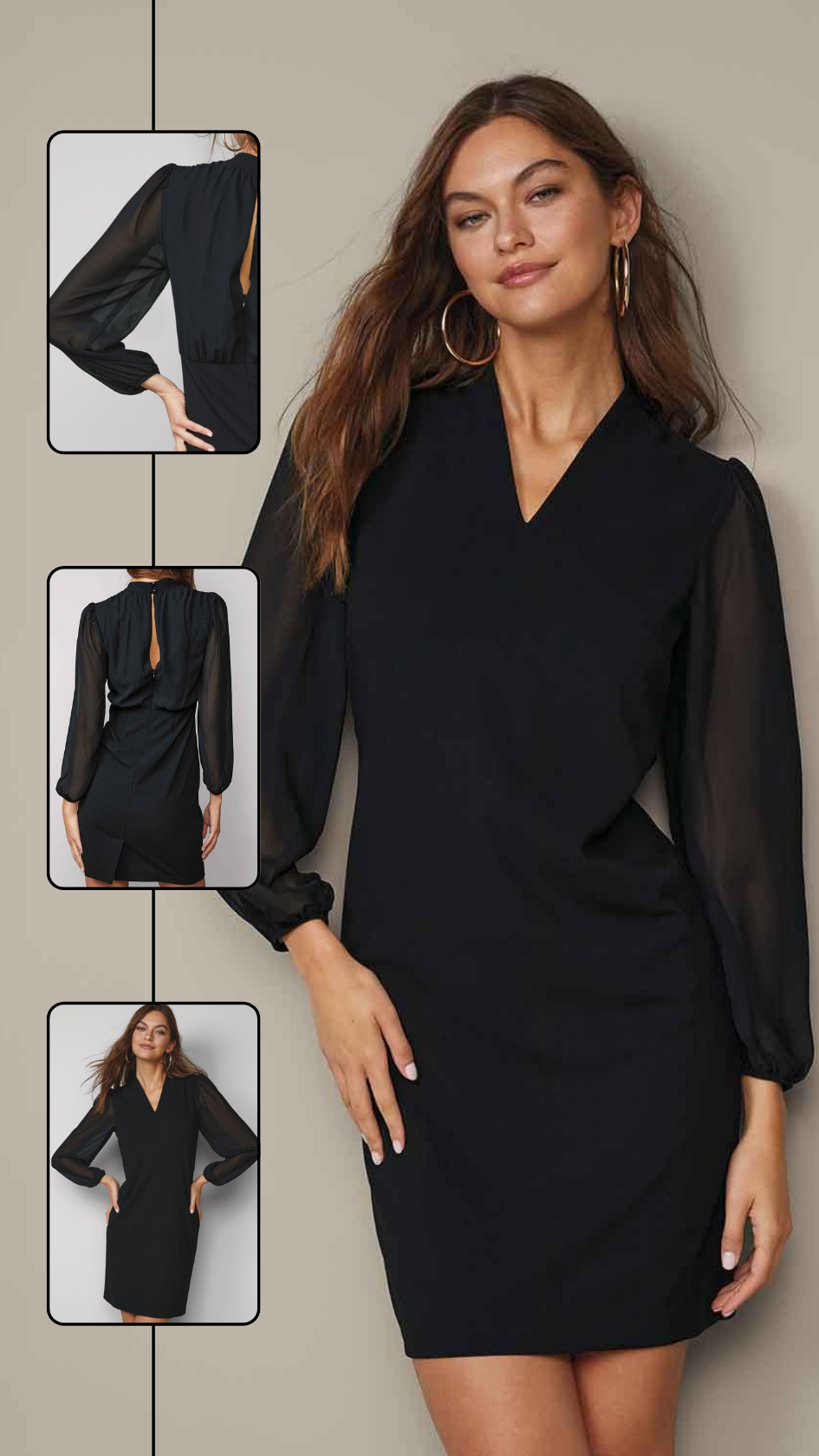 A timeless addition to your evening-out wardrobe. Billowy sheer long sleeves and sheer back add an intriguing element to this demure black V-neck dress. The open-slit detail with double-button closure at neck and zipper closure at bottom of slit elevate this understated design. Center back length: 36 1⁄2" on M; 38" on 1X. Imported.