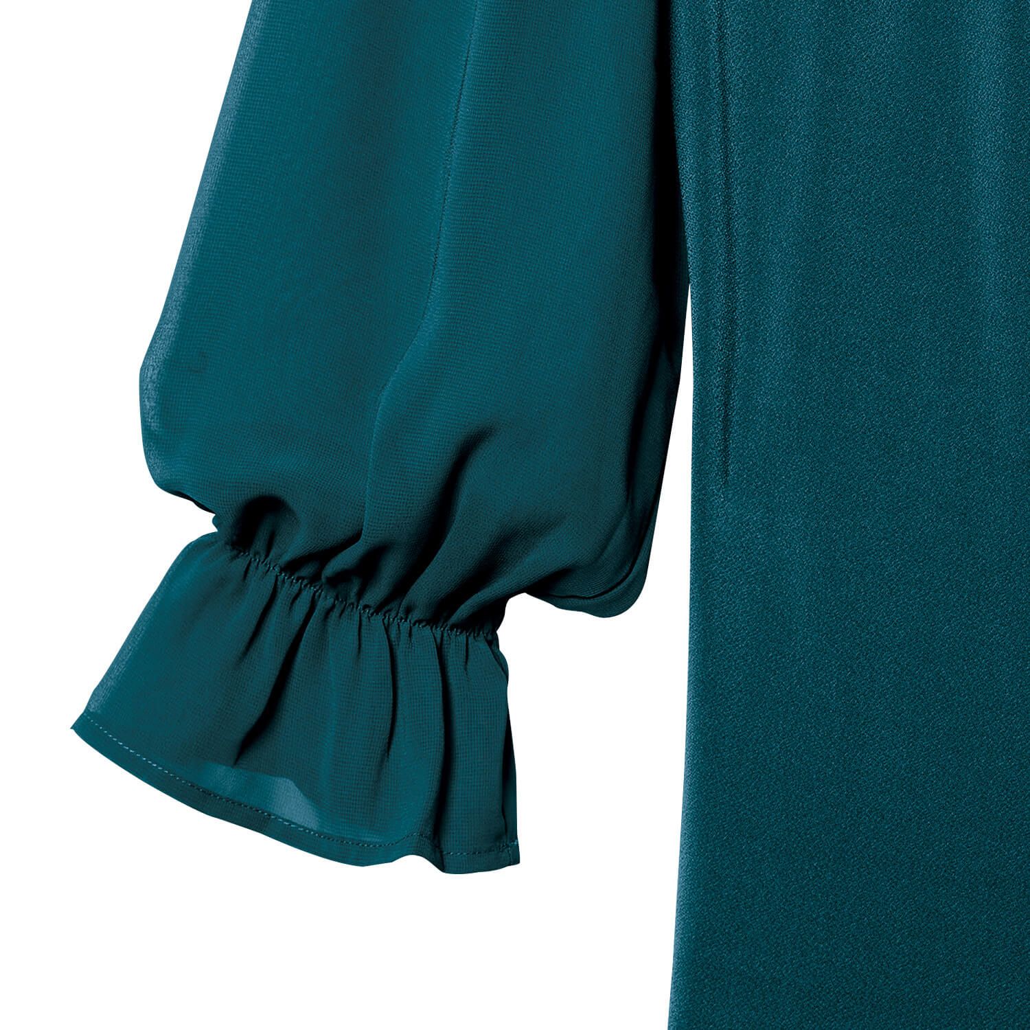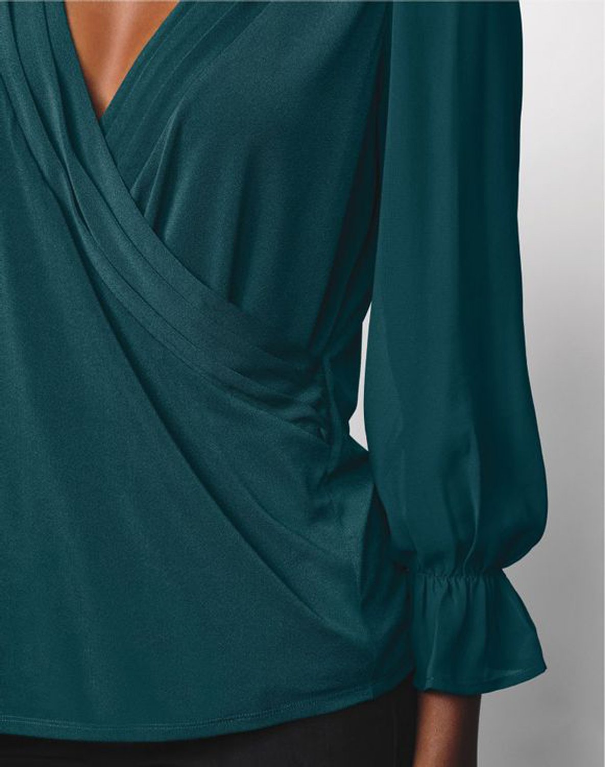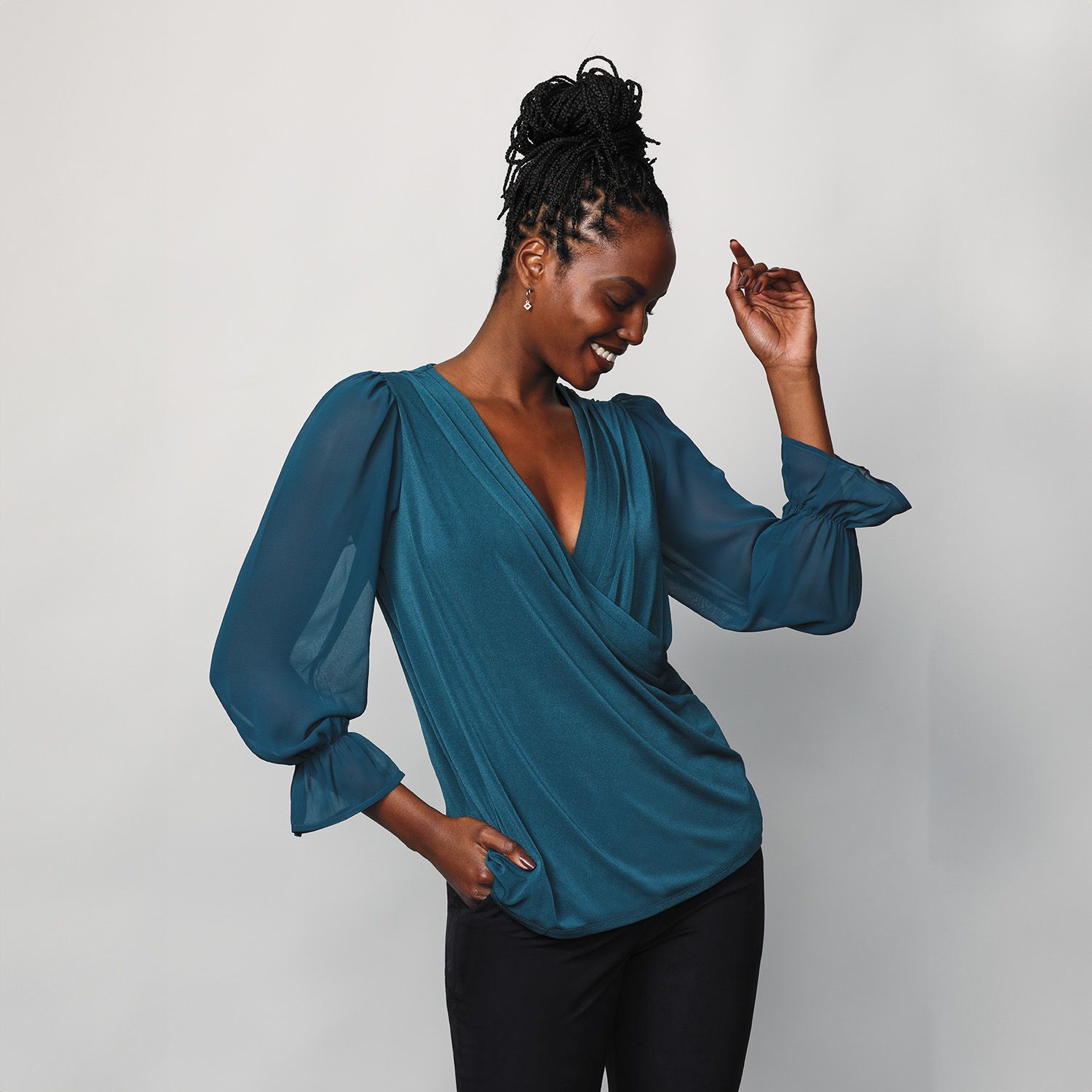 It’s a wrap! Your perfect simple-yet-elegant top in jewel-tone turquoise green. Finished with pretty poet-sleeve details at wrist. Center back length: 25" on M; 27" on 1X. Imported.