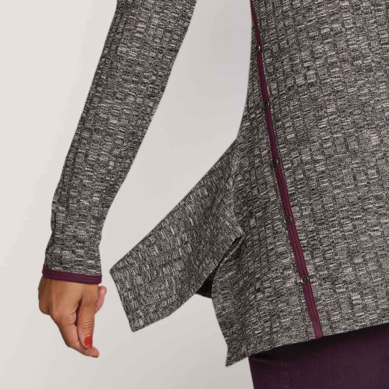 With a flattering flare fit and details for days, this pullover top has it all. On-trend ribbed knit in a gray/brown space-dye mix is outlined with contrasting wine-colored trim detail at the neck, gusset and cuffs. Colored buttons running down the gusset trim add extra charm. Center back length: 28 ¼" on M; 30" on 1X. Imported.