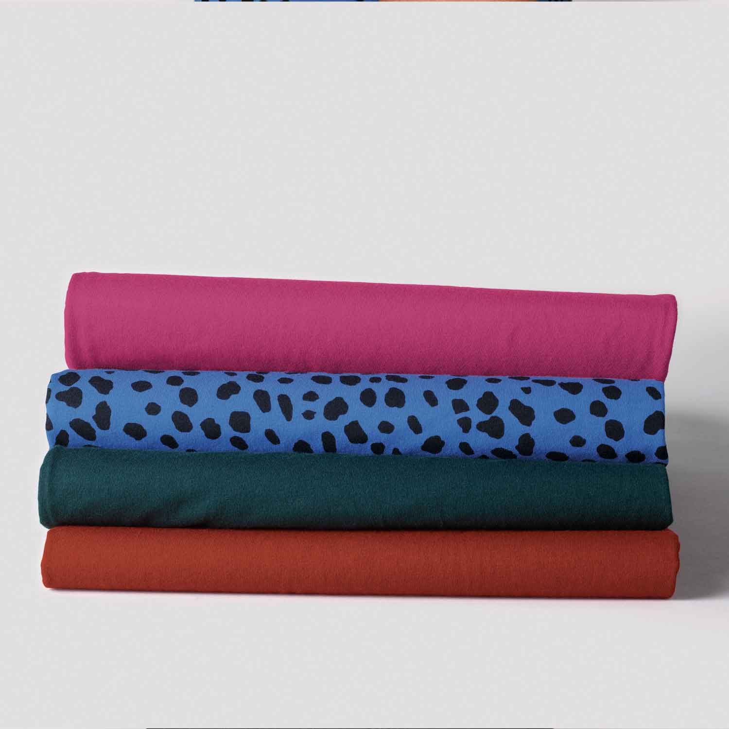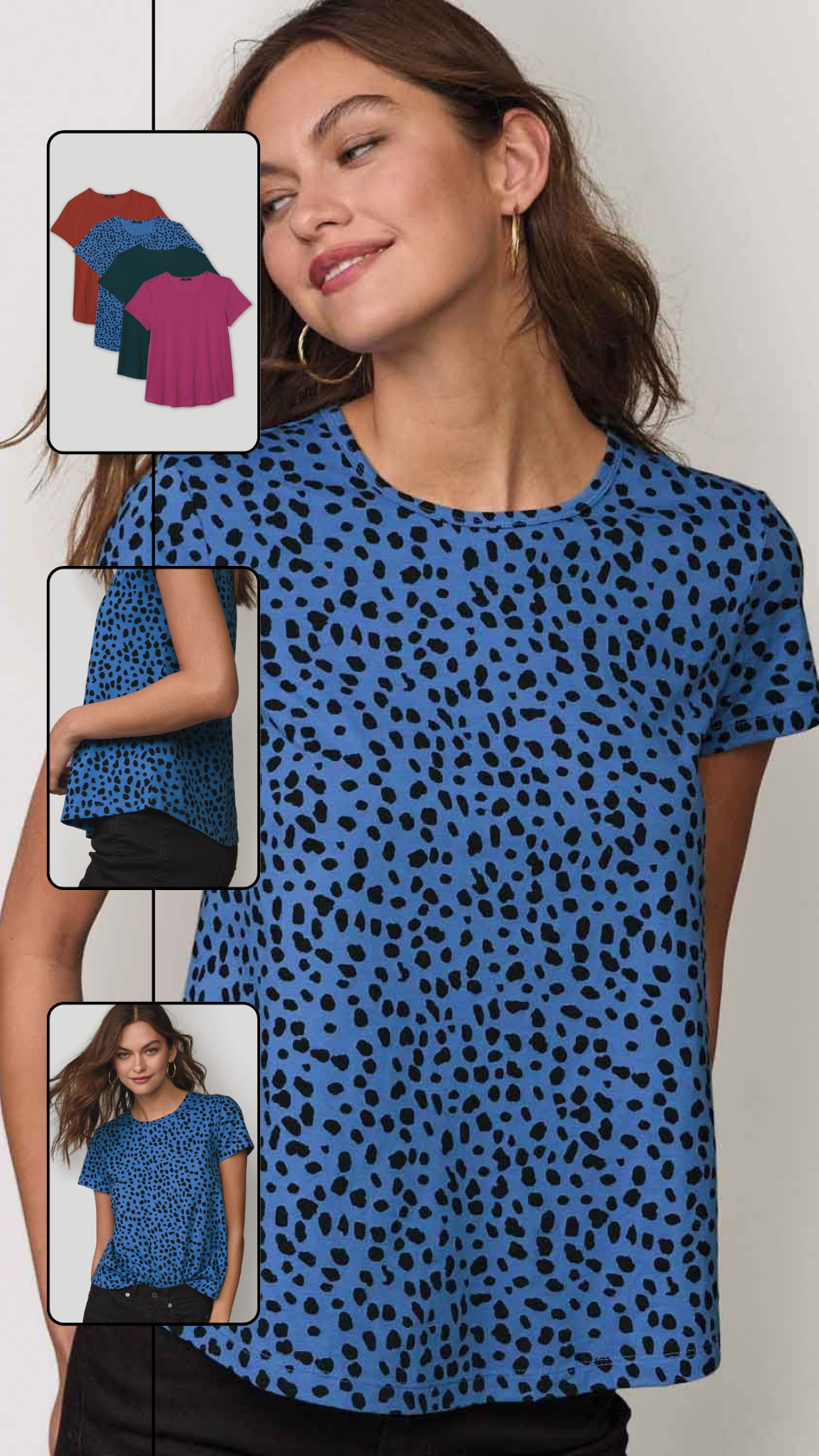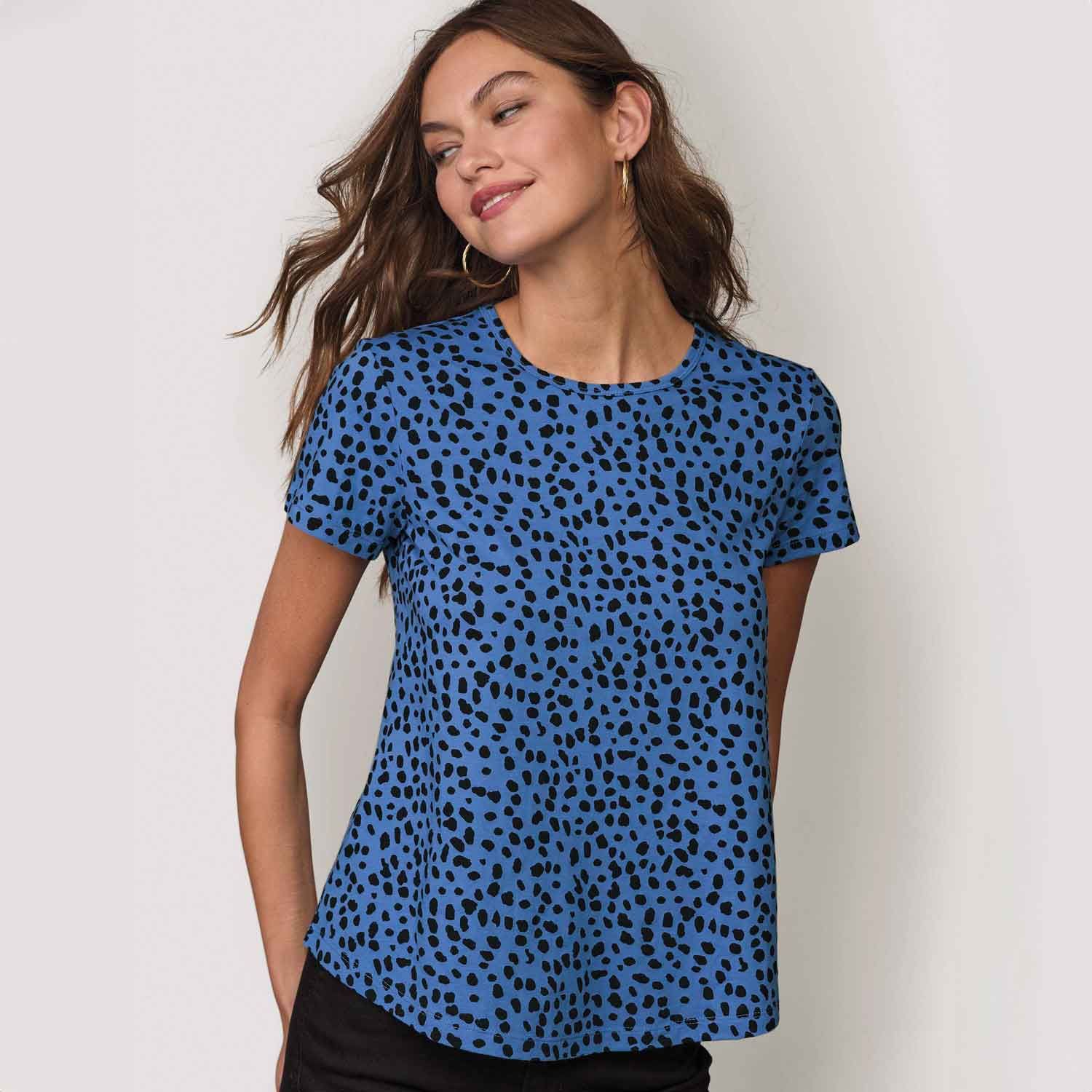Brighten up your basics with a set of classic-fit tees in fresh shades plus a fun pop of print. Pack of four includes f blue with black dot print, fuchsia, dark turquoise and brick red. Center back length: 26" on M; 27" on 1X. Imported.