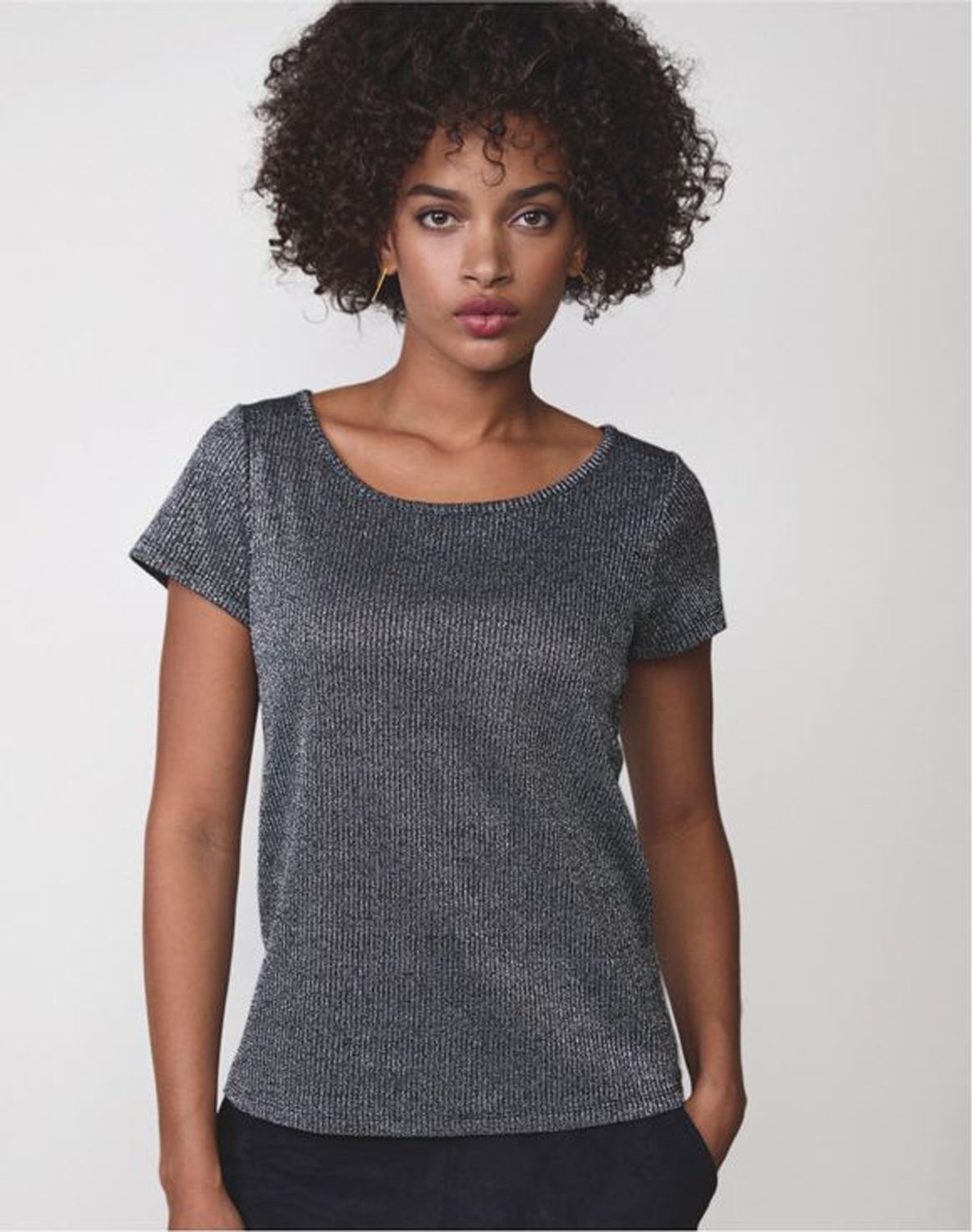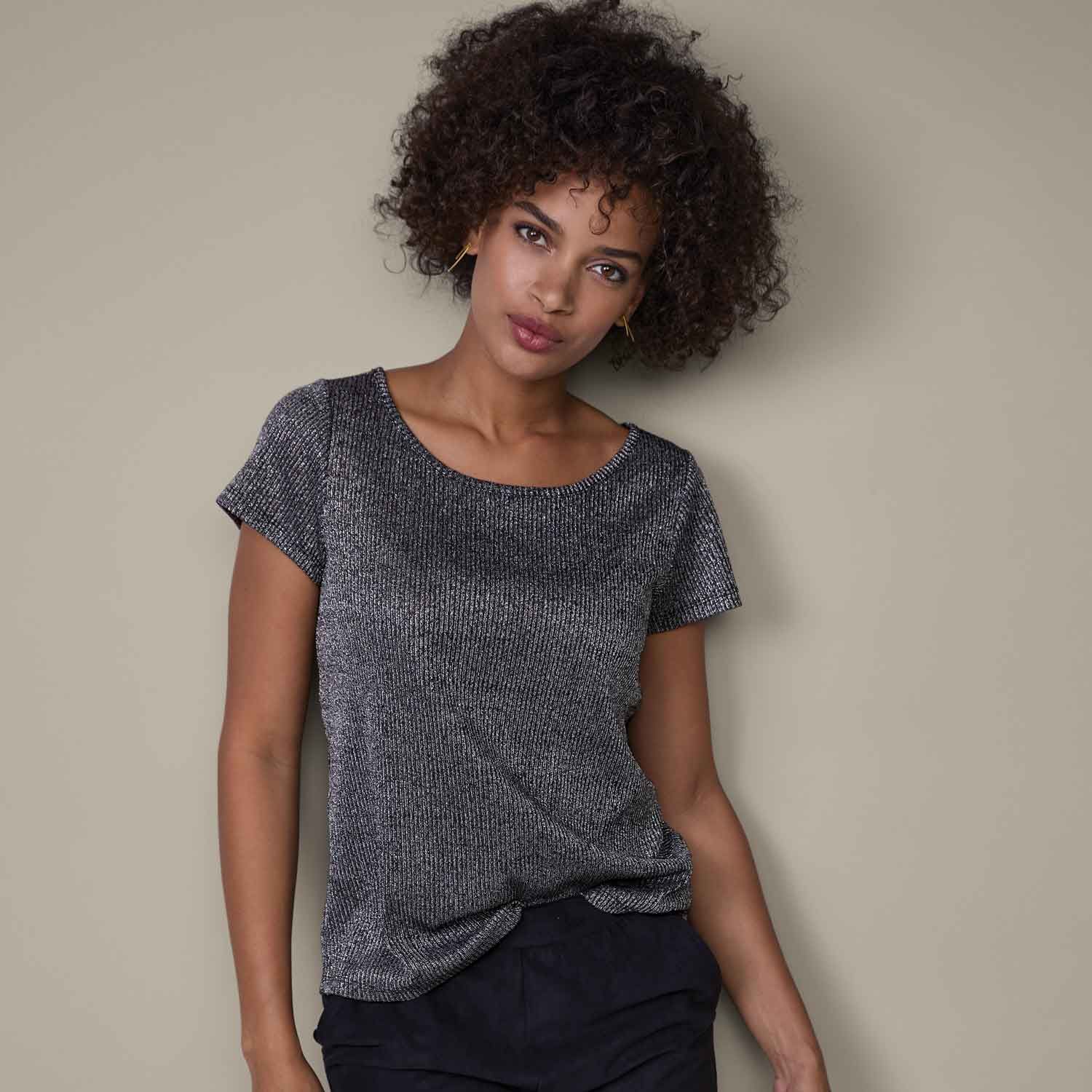 Get a hint of glint. Top things off with a fun metallic knit that puts the spotlight on you. Includes black and purple metallic knit tees with round neckline and short sleeves. Center back length: 22" on M; 24" on 1X. Imported.