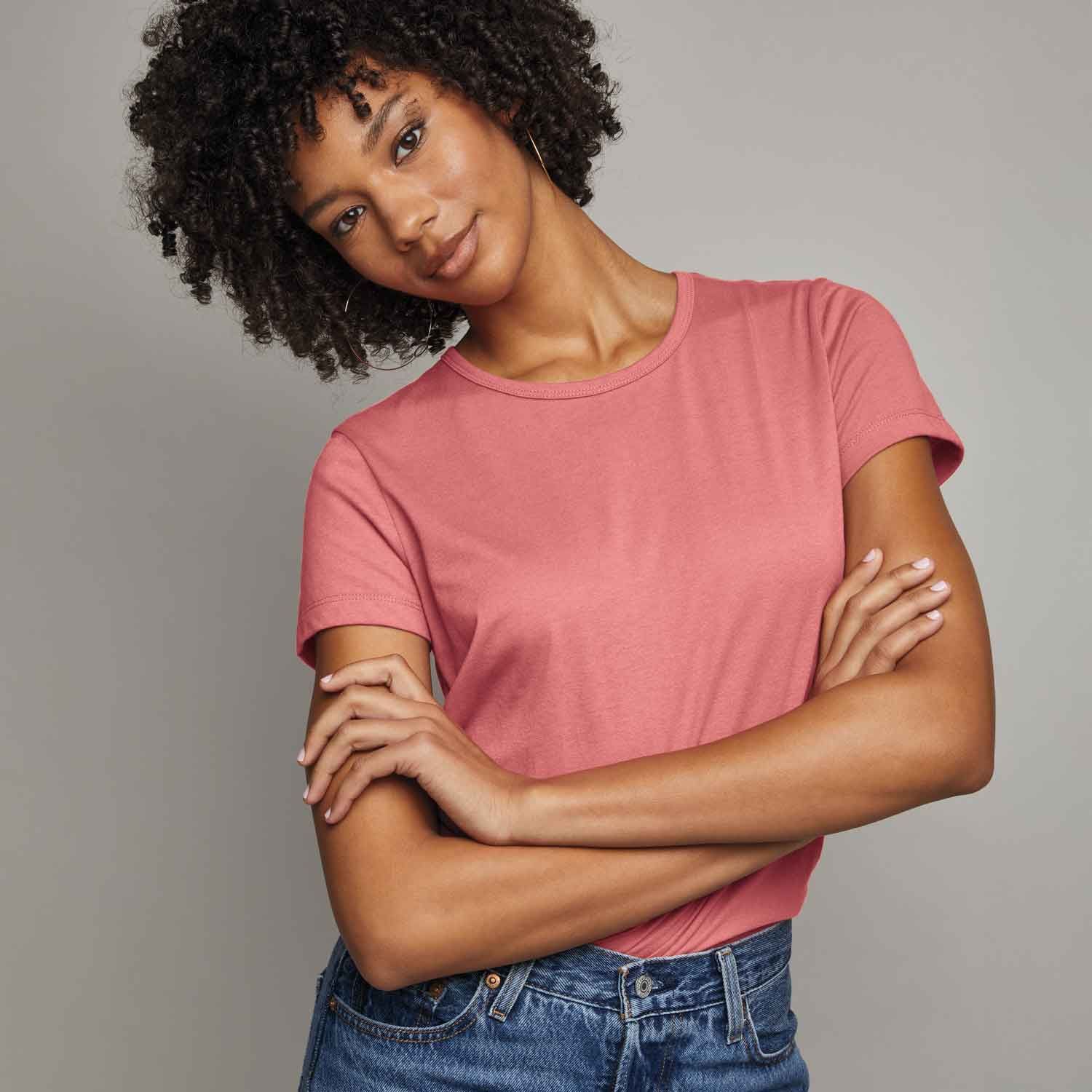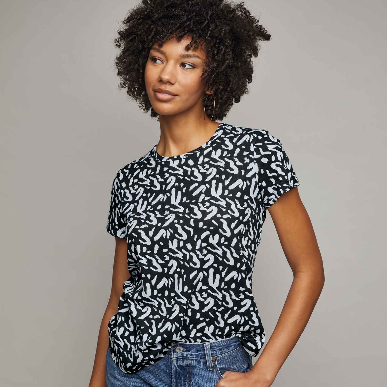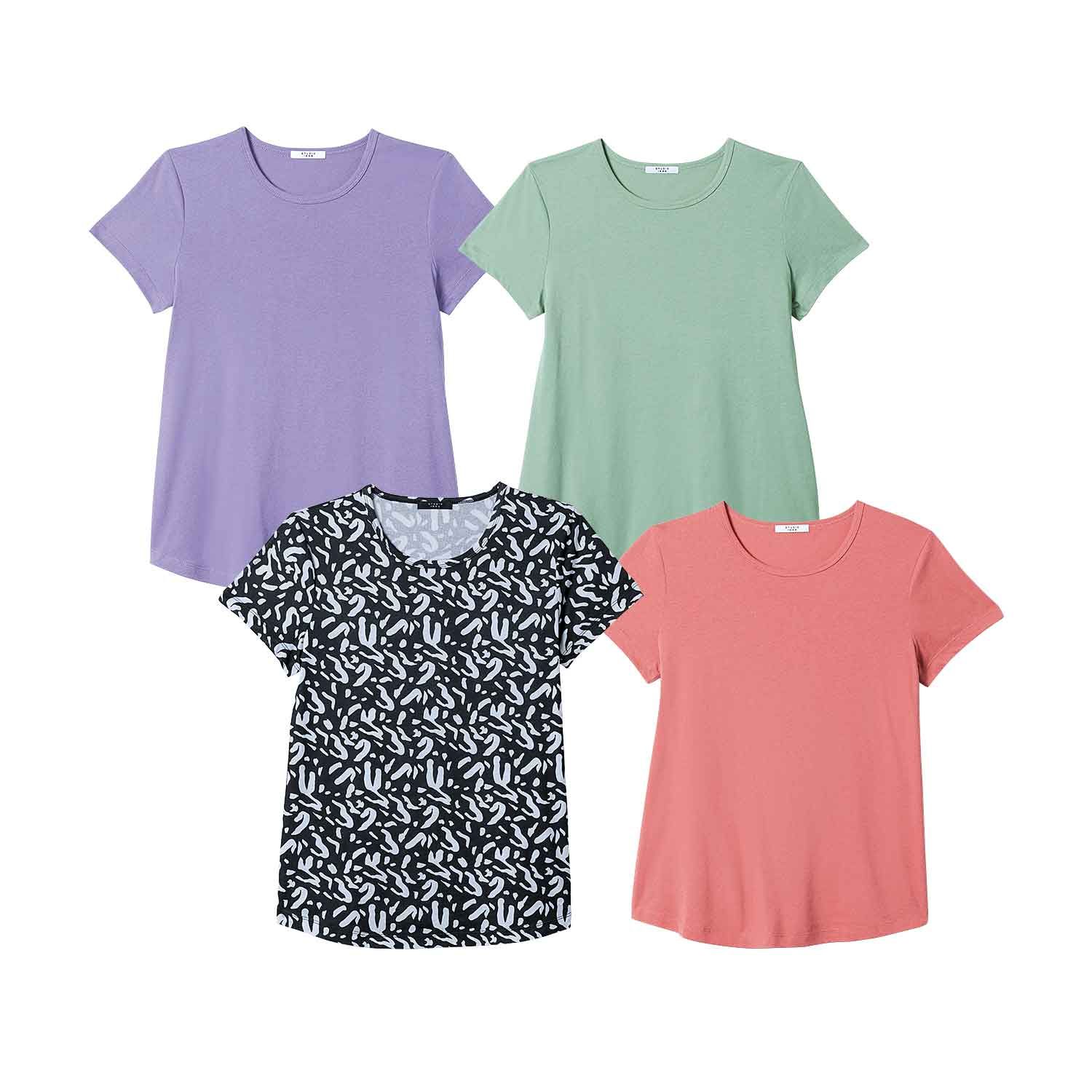 Amp up your basics with a set of classic tees in fresh shades plus a fun pop of print. Pack of four includes dusty green, magenta, light purple and a black-and-white print. Center back length: 25" on medium; 27" on 1X. Imported.