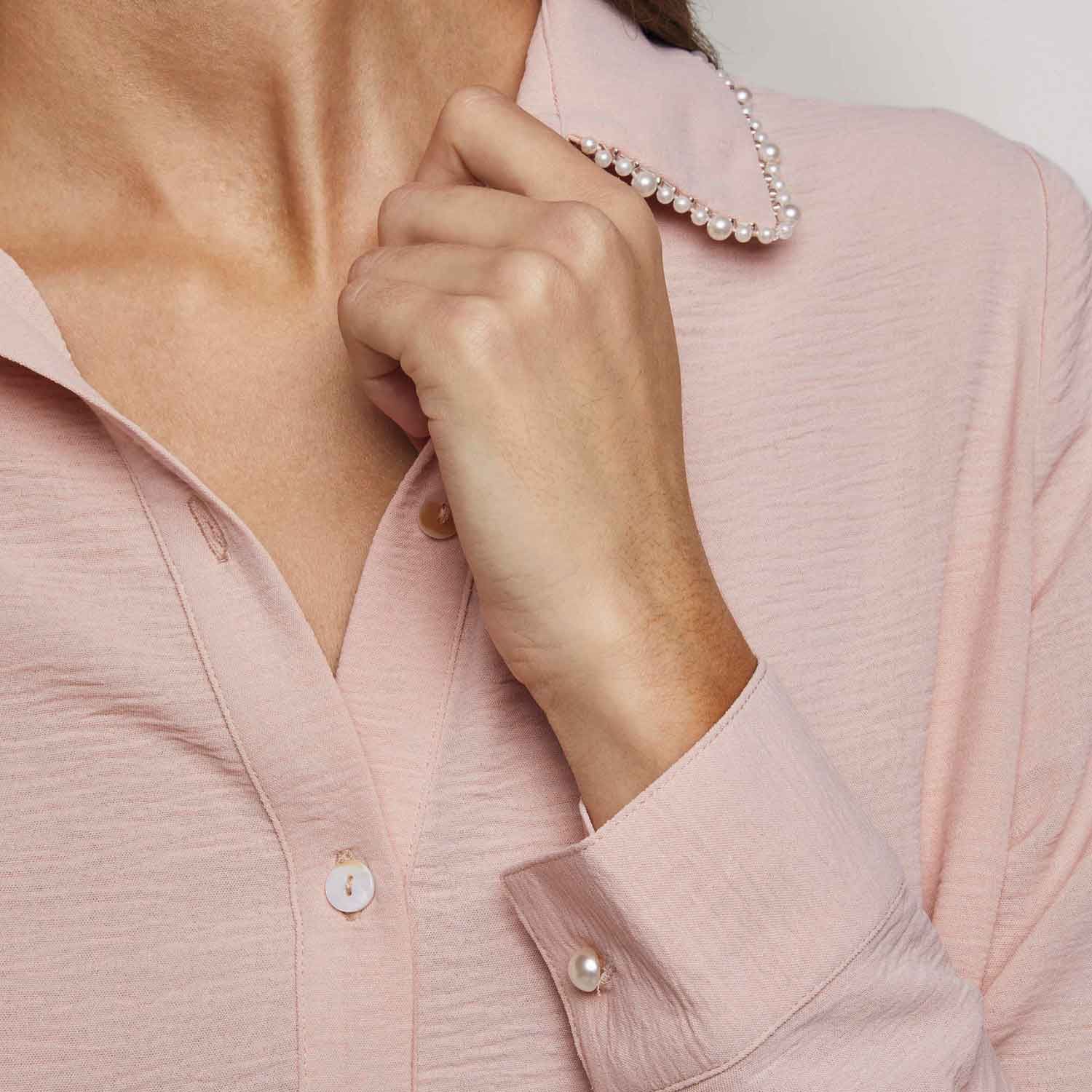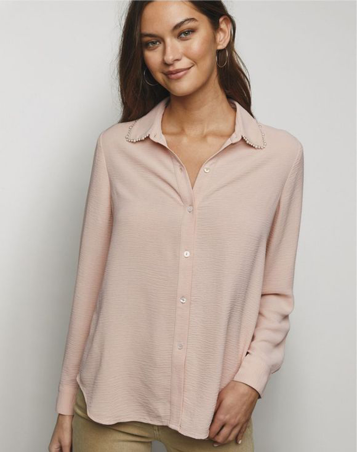A simple button-down silhouette in sweet dusty rose, this textured blouse features a collar lined with pearlesque trim. Pearlesque button cuffs give it a whimsical finish. Center back length: 26" on M; 28" on 1X. Imported.