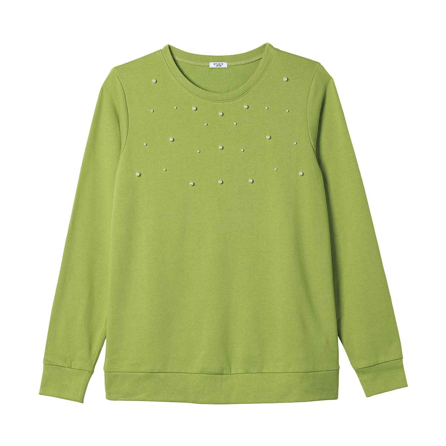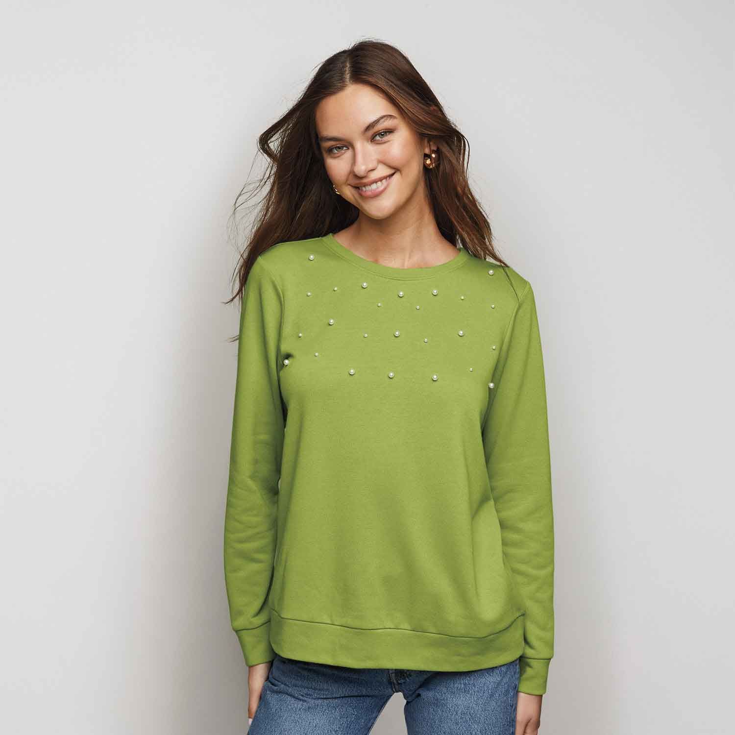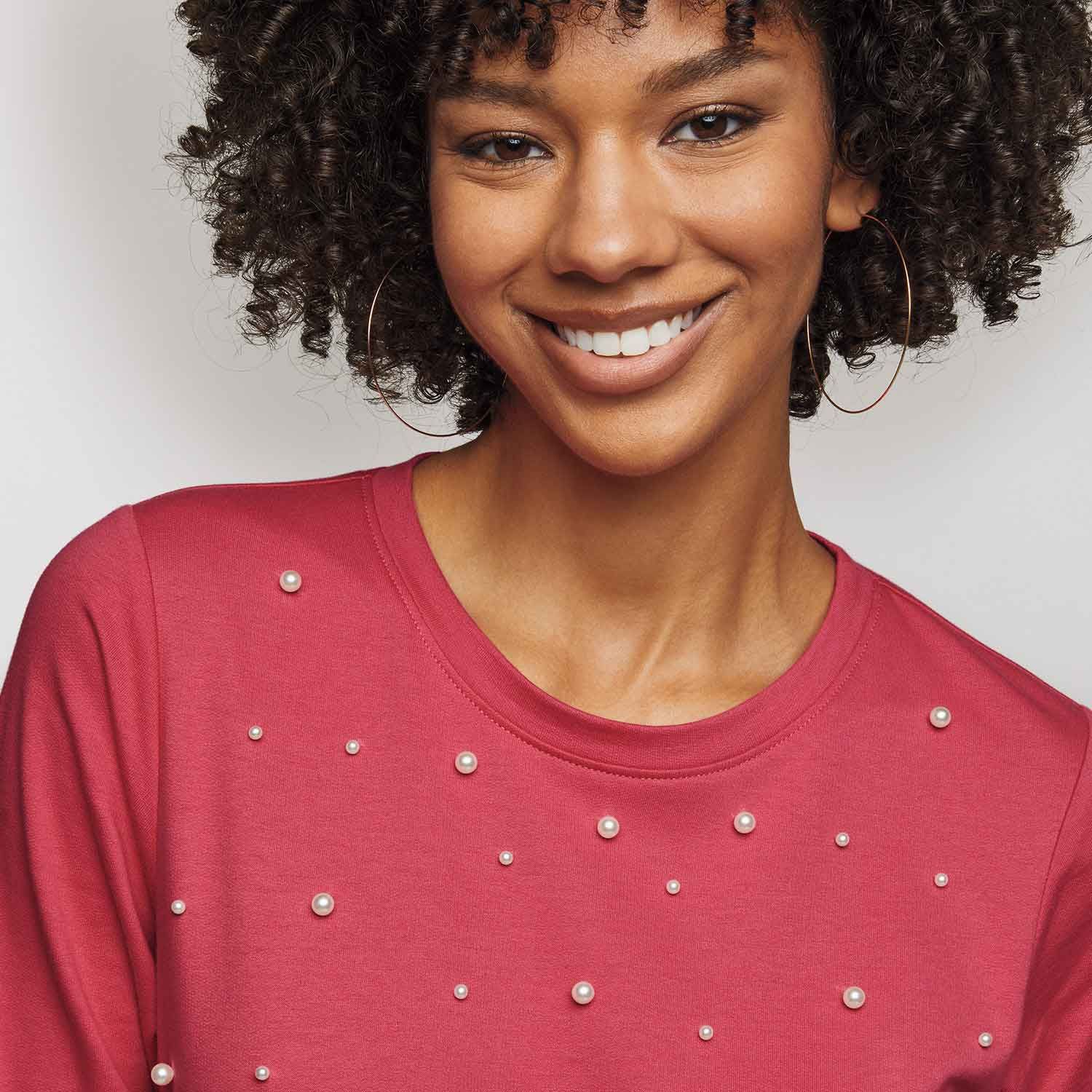 A charming update on the classic pullover, this solid-color top is adorned with pearlesque accents on the front. Center back length: 25" on M; 27" on 1X. Imported.