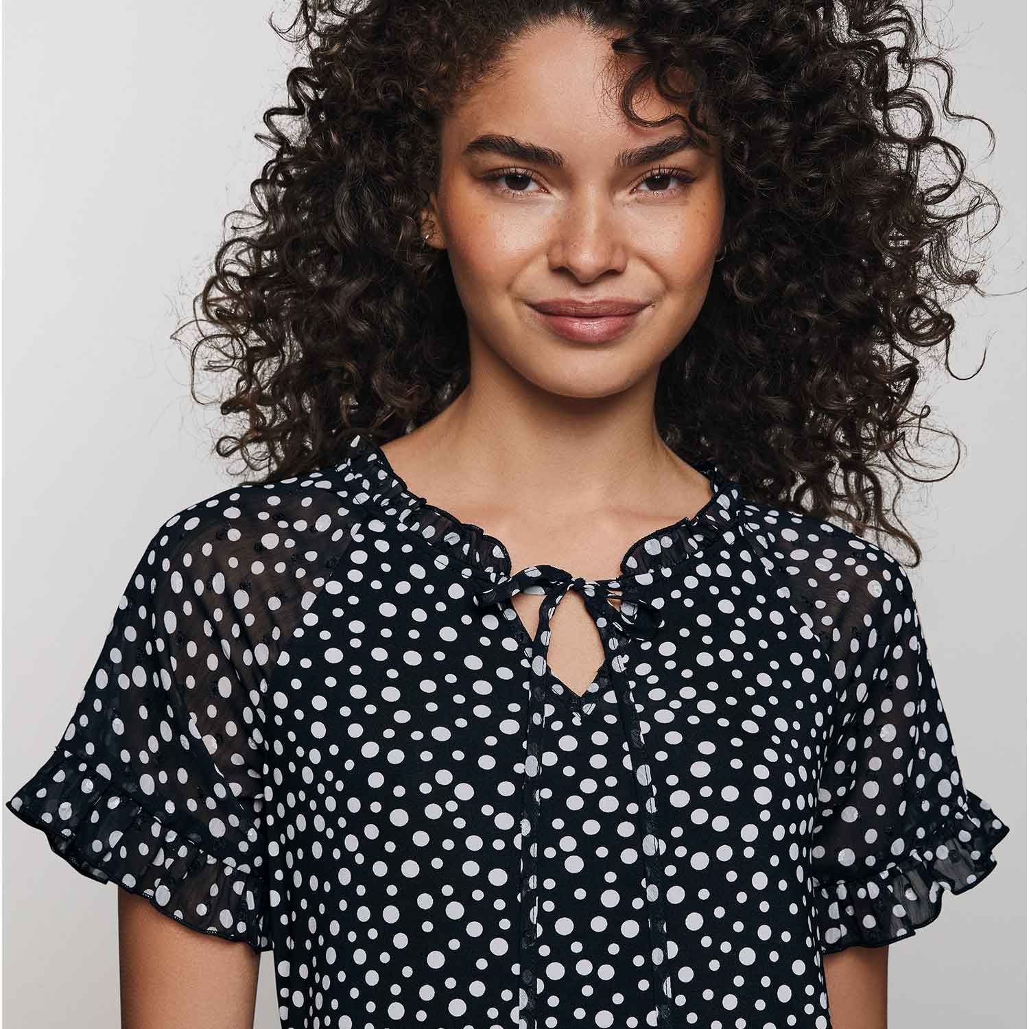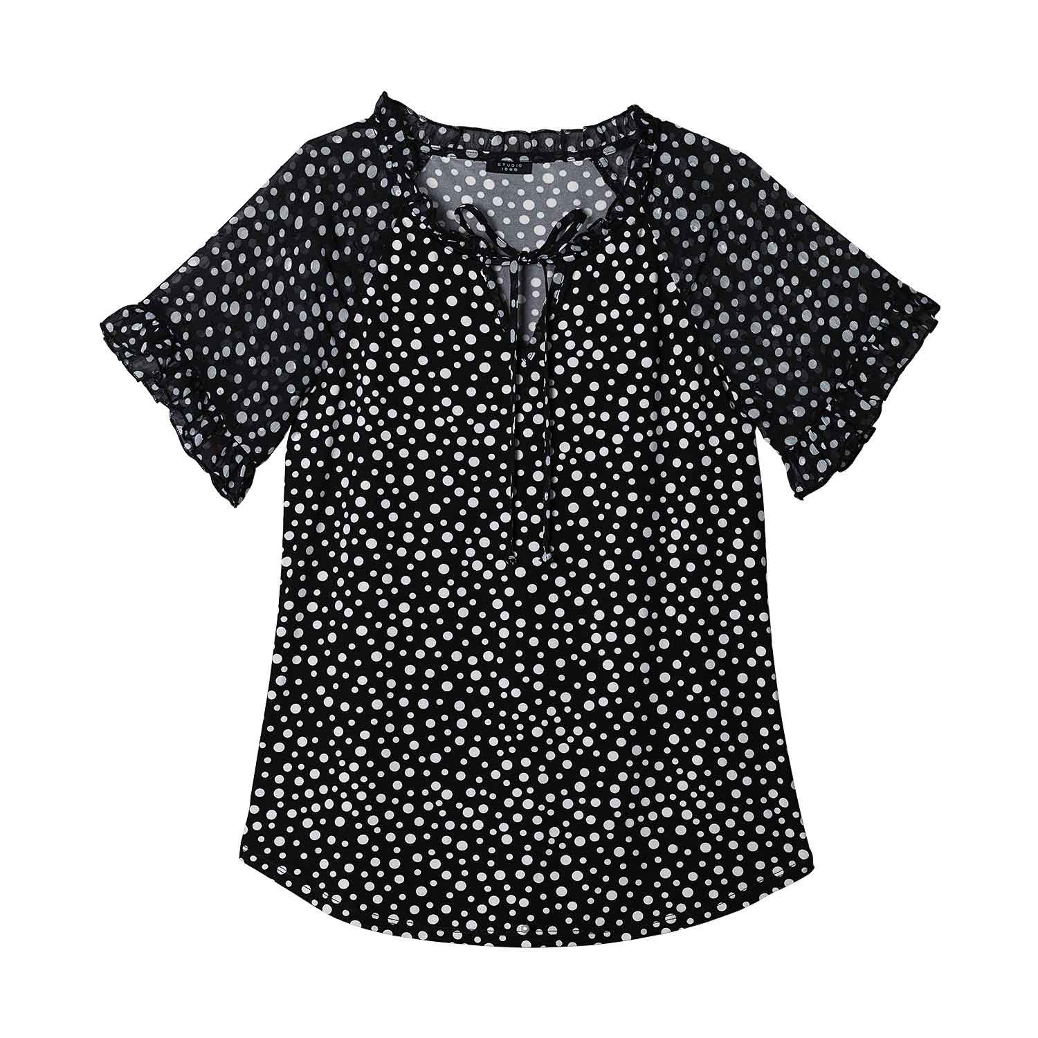 Black-and-white polka dots highlight the timeless appeal of this simple stretch top. Featuring a round ruffle neckline with tie front, this graphic look has sheer short sleeves with ruffle edge and a round hem. Center back length: 26" on M; 27" on 1X. Imported.