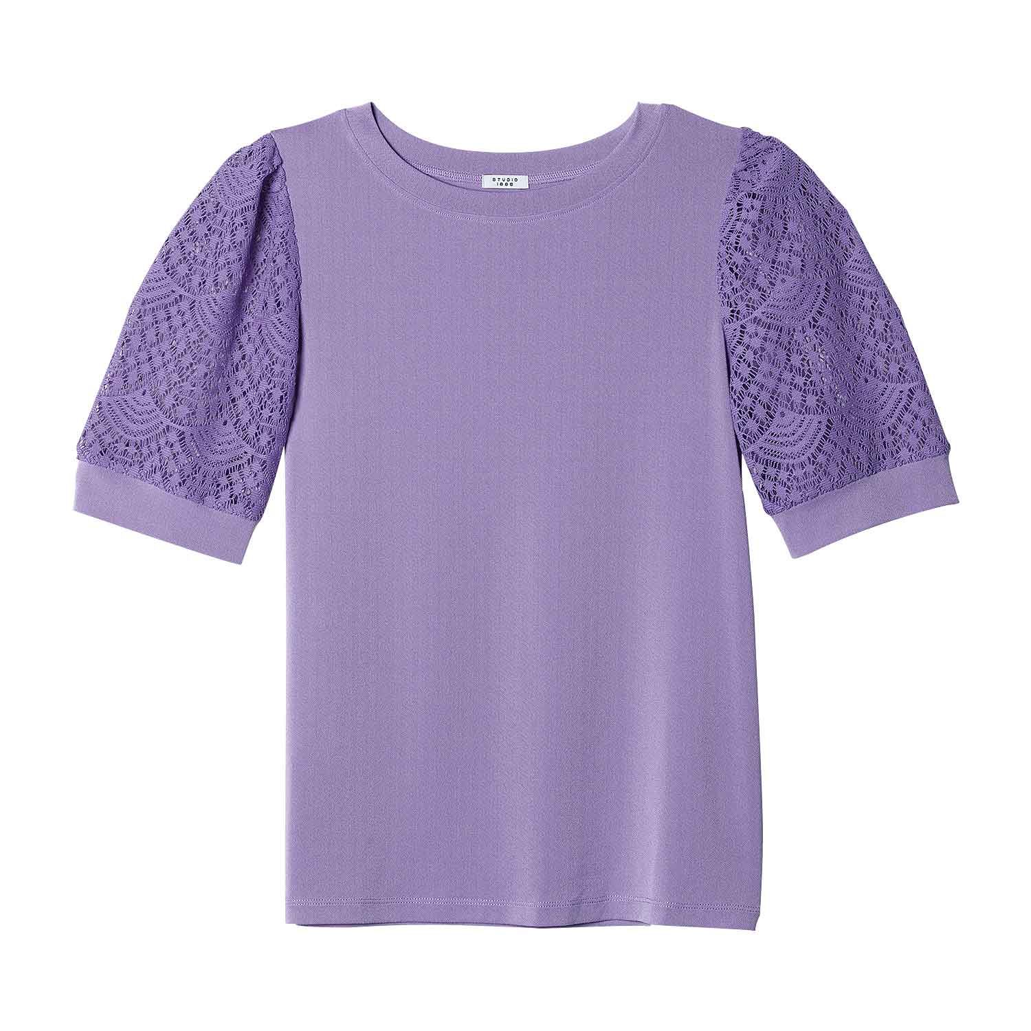 A pared-back look meets romantic lace in this pretty lilac top. Lightweight soft knit is detailed with a round neckline and lacy sleeves with cuffs. Center back length: 23” on M; 24” on 1X. Imported.