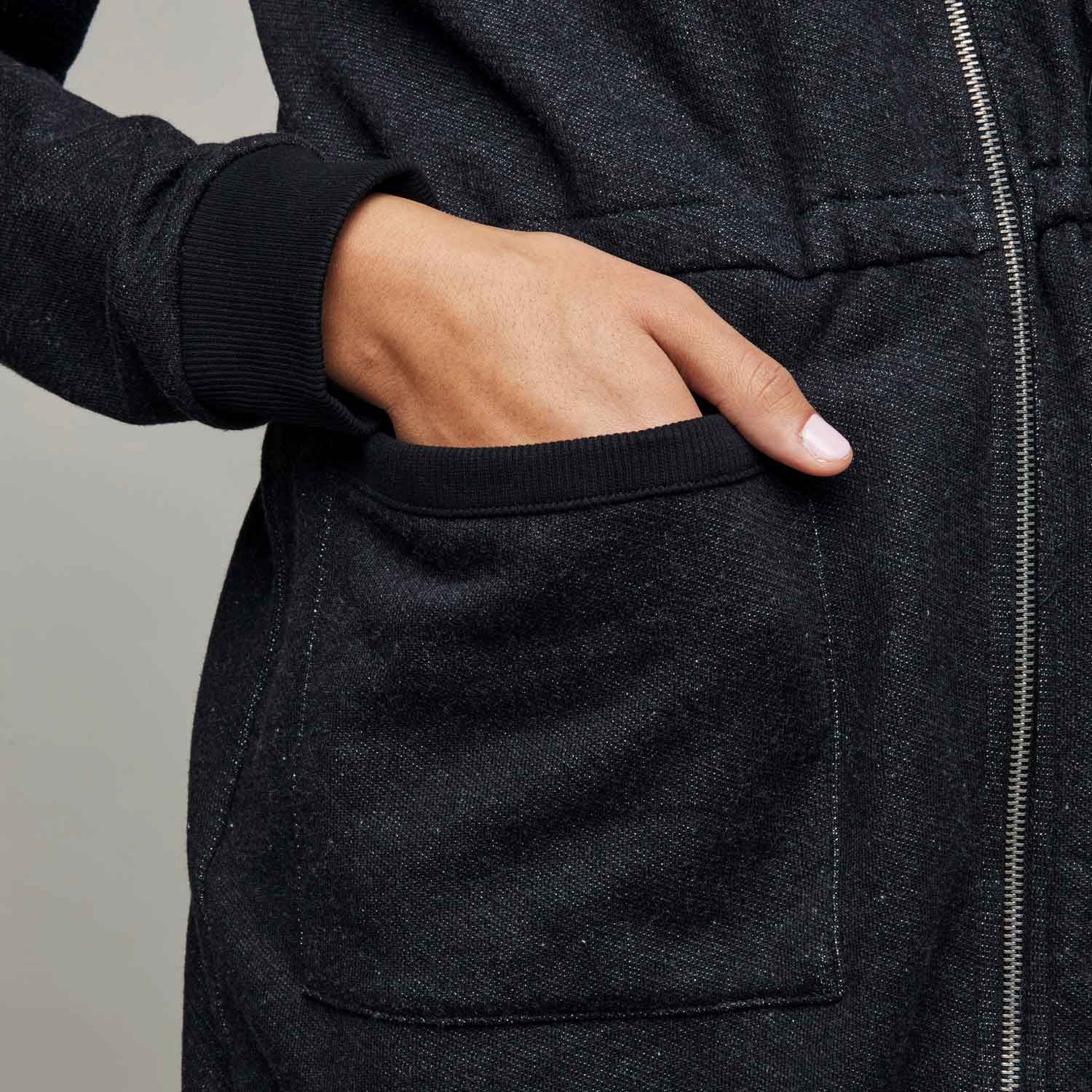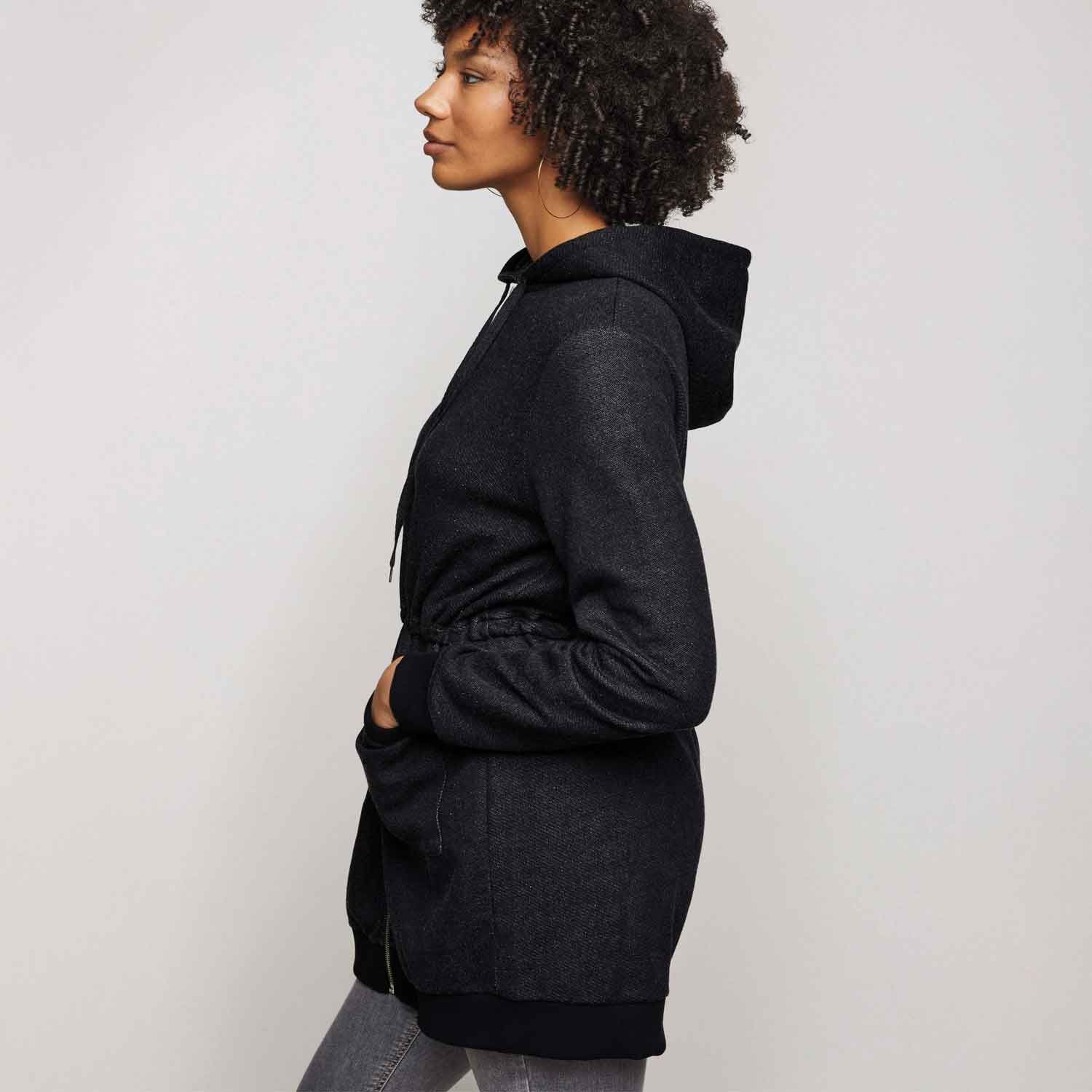 A versatile outerwear staple that's both cool and comfy, this black heathered terry anorak is detailed with contrast solid rib material on the pocket, cuff and hem. A lightweight layer that features long sleeves, front pockets, and a double-layer hood with a drawstring. An inner elastic cording with toggle at the waist can be cinched for a flattering, defined silhouette. Center back length: 34" on M; 35 1⁄2" on 1X. Machine wash, dry flat. Imported.