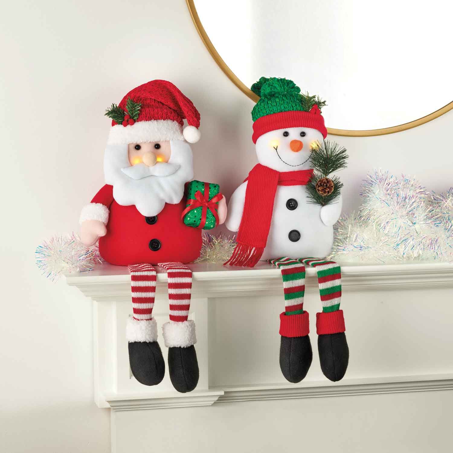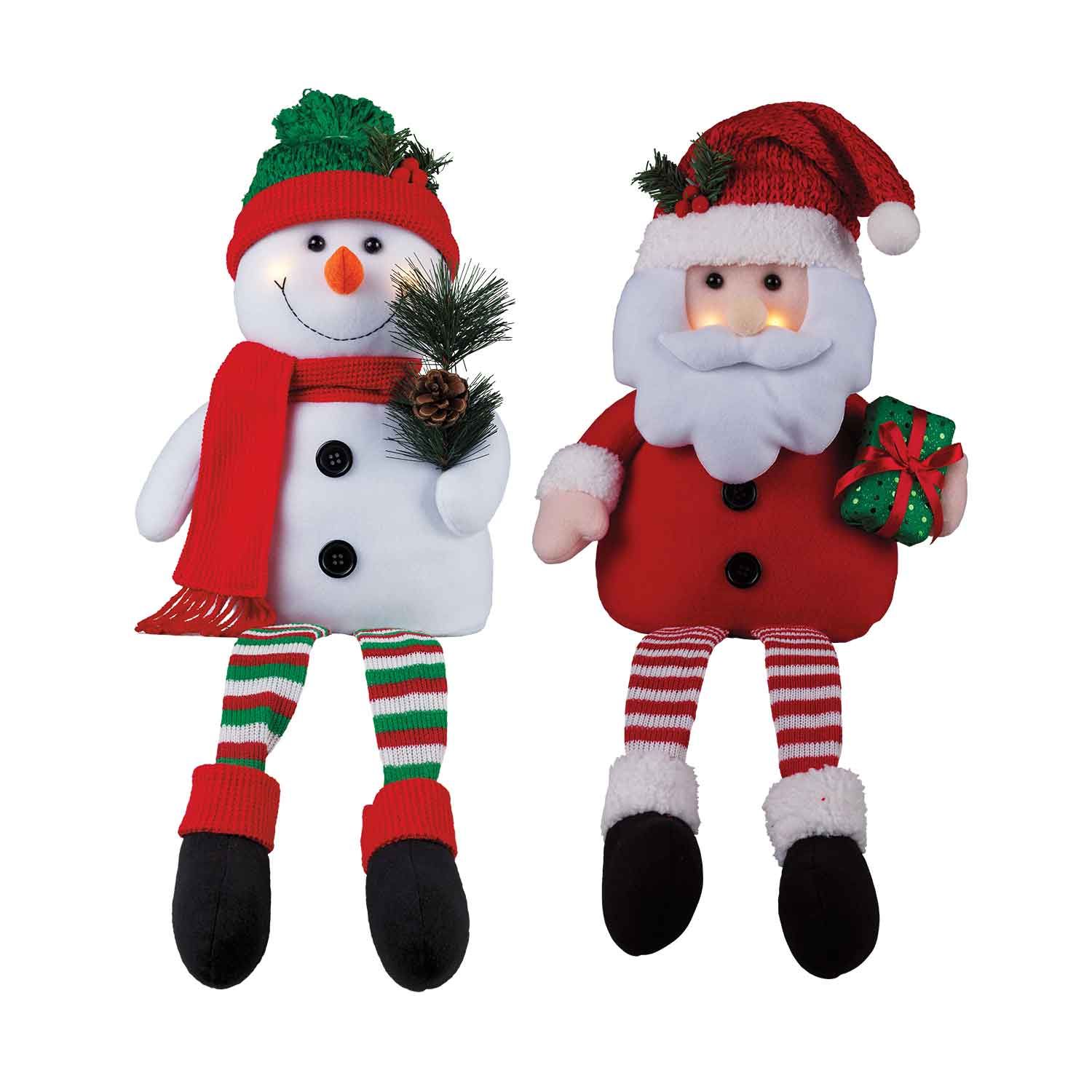 Santa and his snowman buddy are ready for some festive fun and to add holiday cheer to your home. Cheeks light up. Bean bag bottom provides stability. Polyester. Each, 9" W x 5" D x 25" H. Imported.