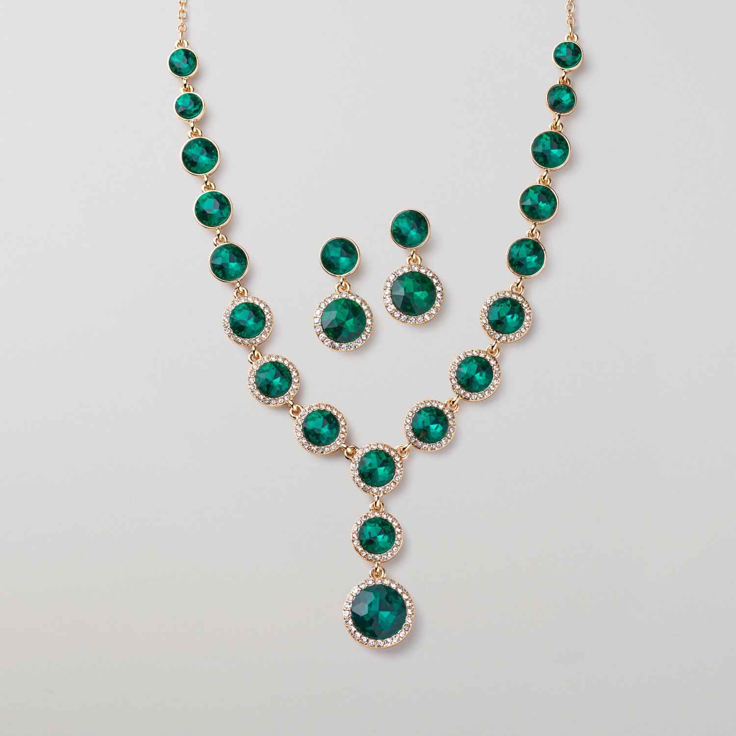 Elegance and glamour unite in this two-piece set featuring a captivating lariat necklace and matching drop earrings composed of emerald-colored glass beads and pavé stones set in goldtone. Matching bracelet also available.