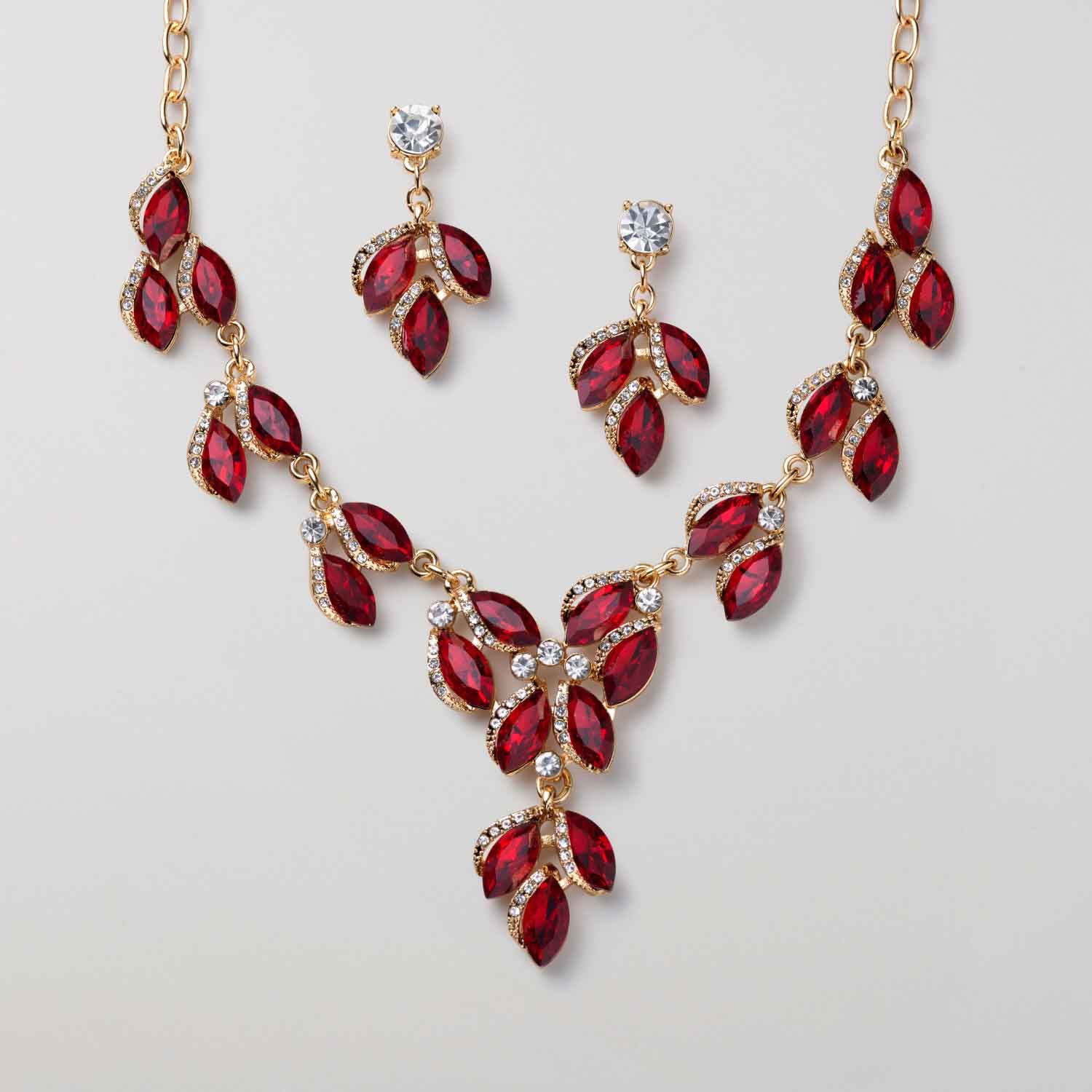 Set the season ablaze in style with an eye-catching statement set. Matching necklace and earrings feature Siam-colored glass stones and pavé stones set in goldtone for regal look.