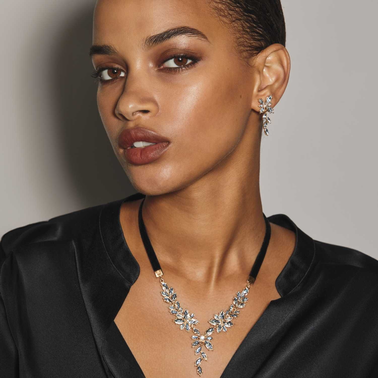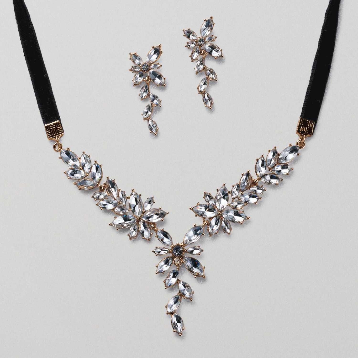 • Set of black velvet necklace with glass stones set in goldtone and glass stone cascade earrings