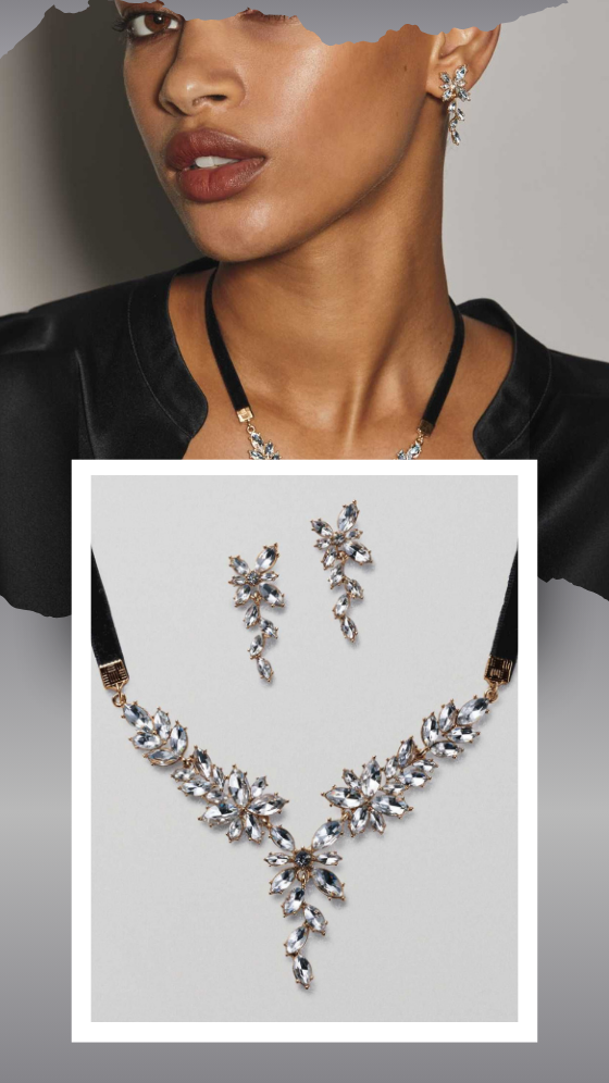 Black velvet and crystal-like glass stones make a classically elegant pairing in this party-ready necklace and earring set.