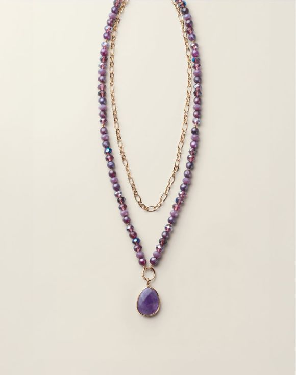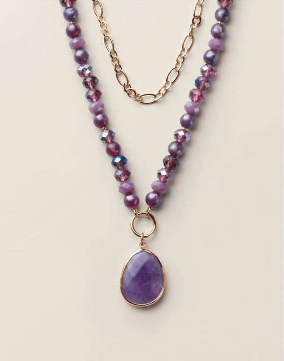 Layer on the sparkle. A stunning blend of rich plum-hued glass faceted beads and gleaming goldtone links, designed with glam sophistication. A genuine semi-precious amethyst pendant adds a bold, natural touch—making this piece as powerful as it is beautiful.