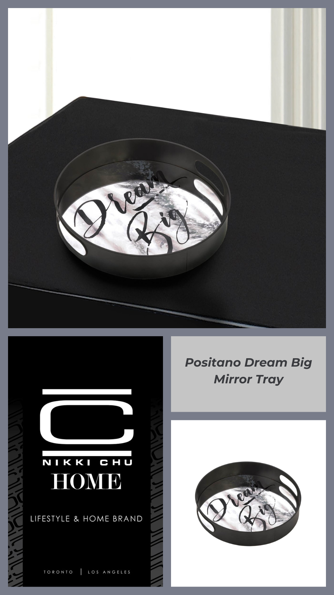 A beautiful display for your smaller items, the Positano "Dream Big" Round Mirror Tray features a gorgeous antique wash background and black cursive text that will add inspiration to your decor. • Round tray with side handles. Black cursive writing.
