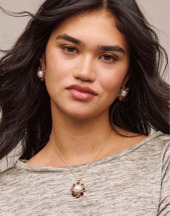 The look of antique elegance with pops of color. Matching necklace, earrings, and ring feature a luminous pearlesque center bead accented by warm-toned glass stones, creating a look that’s both timeless and radiant.