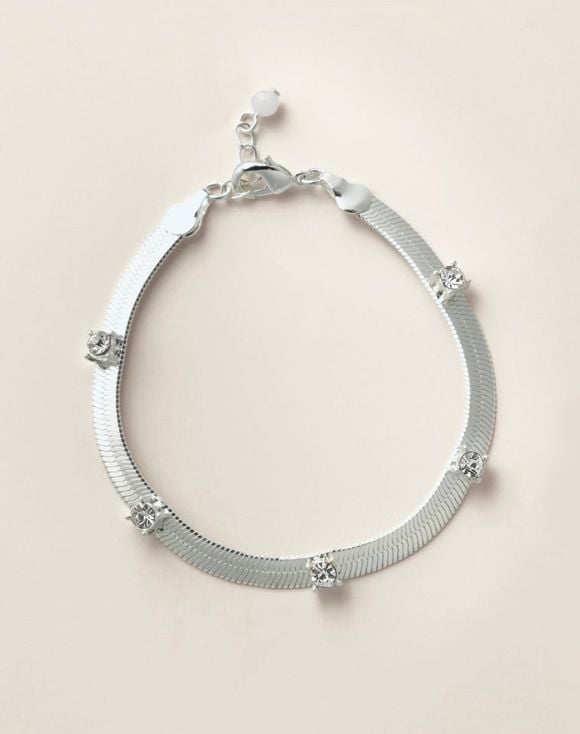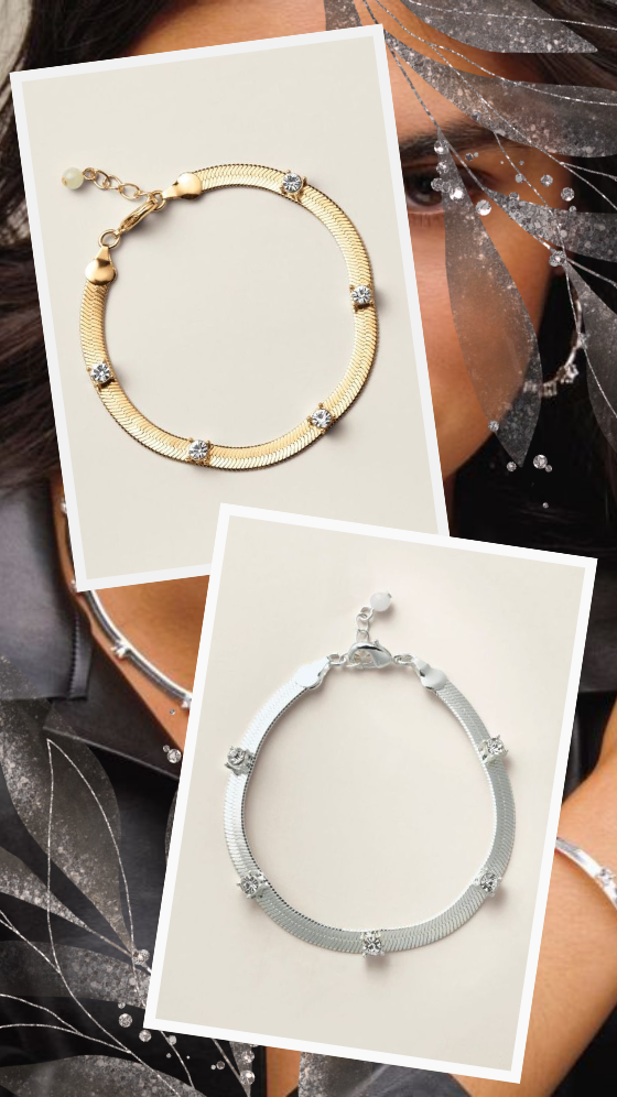 Polished shine with subtle sparkle. Designed with a sleek snake chain and shimmering crystal stations, this bracelet is the perfect balance of simplicity and sophistication. Available in silvertone or goldtone, it’s the perfect balance of simplicity and sophistication.