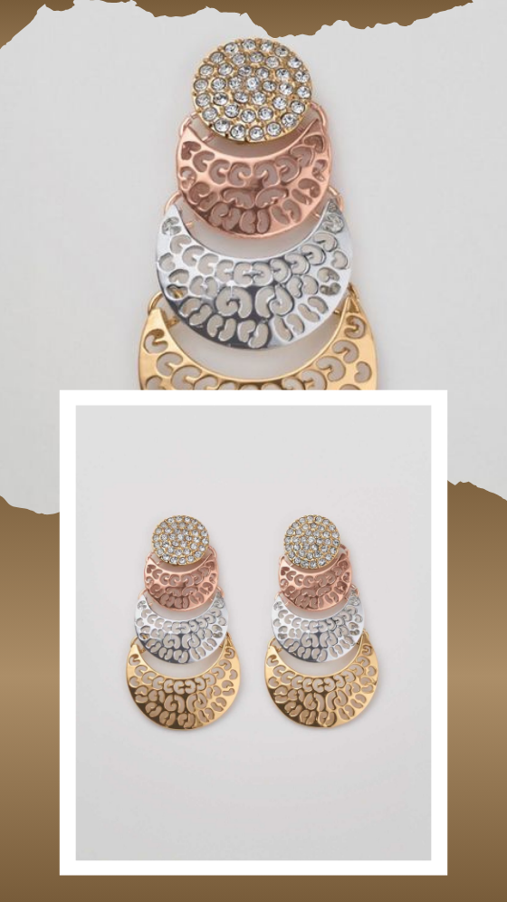 A stunning display of openwork and mixed metals. Tri-tone drop earrings feature elaborate filigree styling adding vintage charm for a bold yet refined statement. Matching necklace and bracelet also available.
