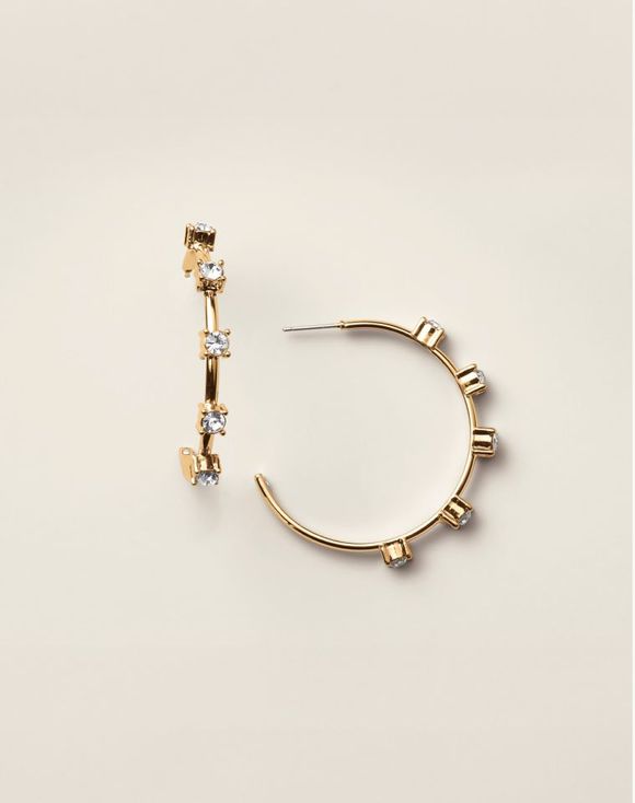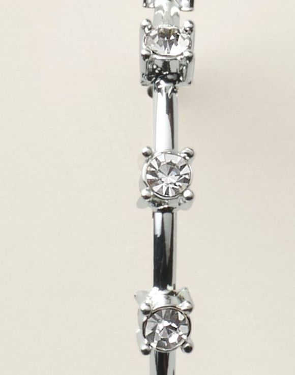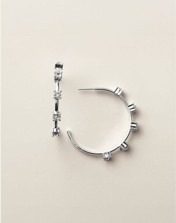A modern twist on timeless sparkle. These contemporary hoops feature crystal station accents that glimmer beautifully along a sleek, polished curve. Lightweight and luminous, they bring just the right amount of shine to any occasion.