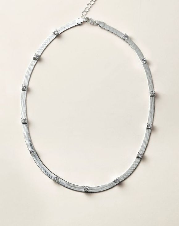 Modern and refined, this snake chain necklace features shimmering crystal stations that catch the light with every movement. Available in silvertone or goldtone, its smooth texture and understated sparkle make it a timeless piece that shines effortlessly from day to night.