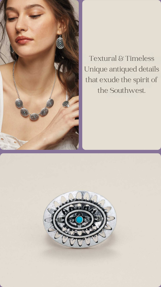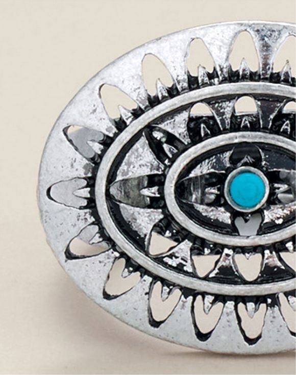 With a textured antiqued silvertone finish and a turquoise-colored center, this eye-catching design brings vintage western vibes to your everyday look.