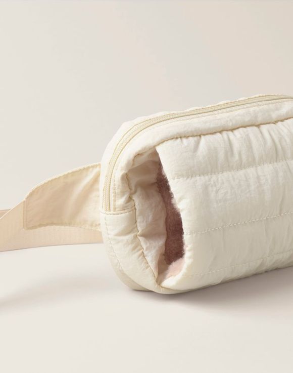 Your new cold-weather sidekick: a cute and guilty pleasure that doubles as a bag and hand warmer. This soft nylon quilted belt bag in versatile ivory features a faux fur-lined front pocket for keeping hands toasty. Includes a zip pocket on the back panel and inside for additional organization. The adjustable strap and secure buckle ensure a perfect fit. Imported.