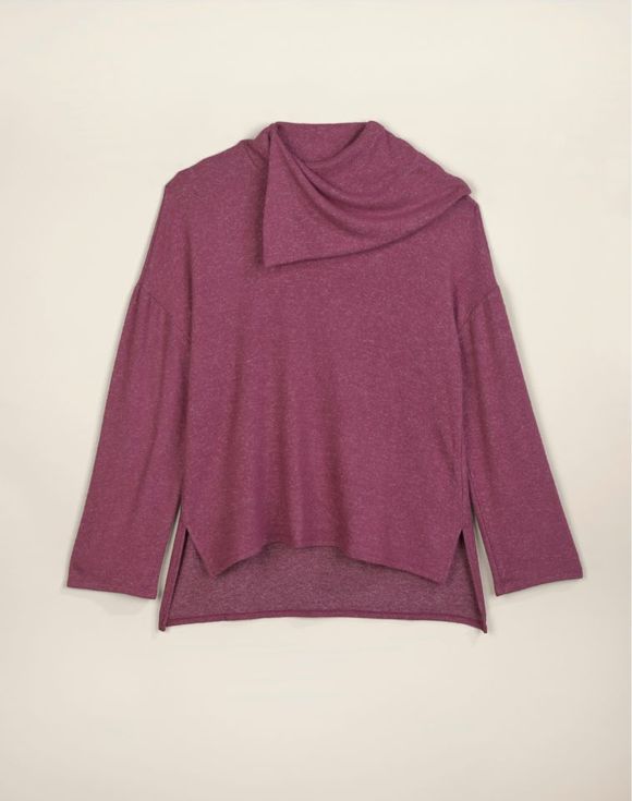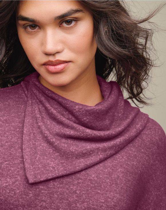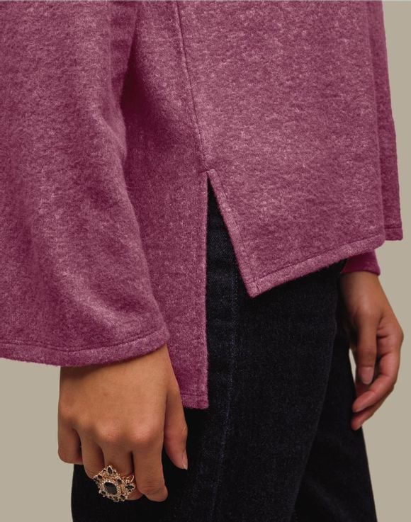 Rethink the basic pullover. The side collar adds angular flair to this classic silhouette. Featuring drop-shoulder details and a high-low hem with side slits, this cold-weather staple epitomizes effortless sophistication. Center back length: 26" on M; 28" on 1X. Imported.