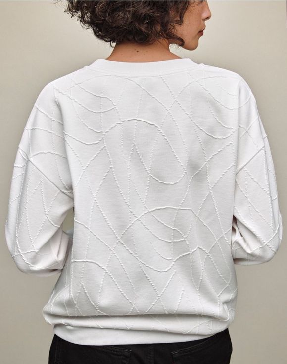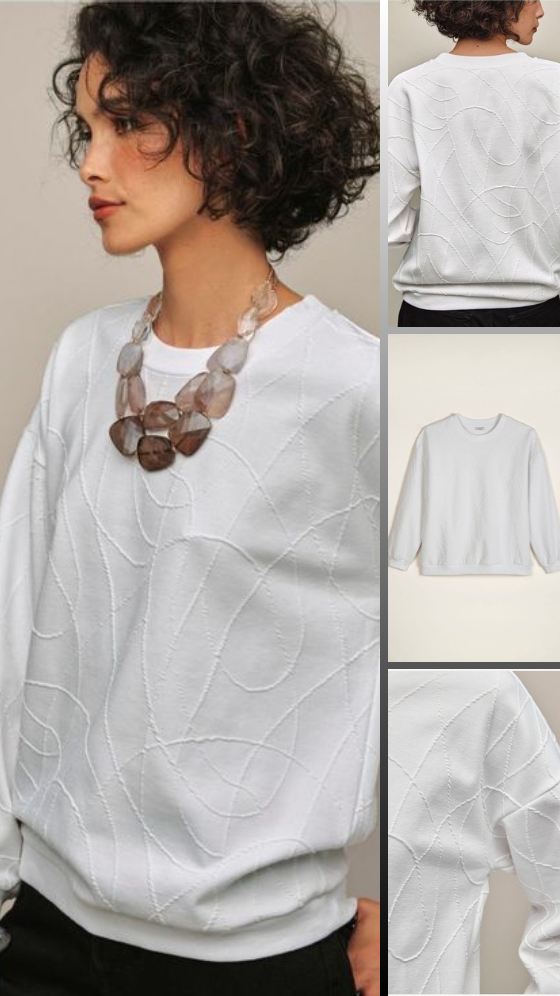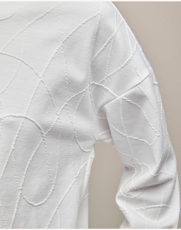 A white knit top with textural intrigue. Showcasing abstract curved lines that bring subtle dimension and relaxed style, this top is designed with a round neckline, long sleeves and ribbed cuffs and hem. An elevated essential that moves effortlessly from understated to head-turning statement. Center back length: 24 1⁄2" on M; 26" on 1X. Imported.