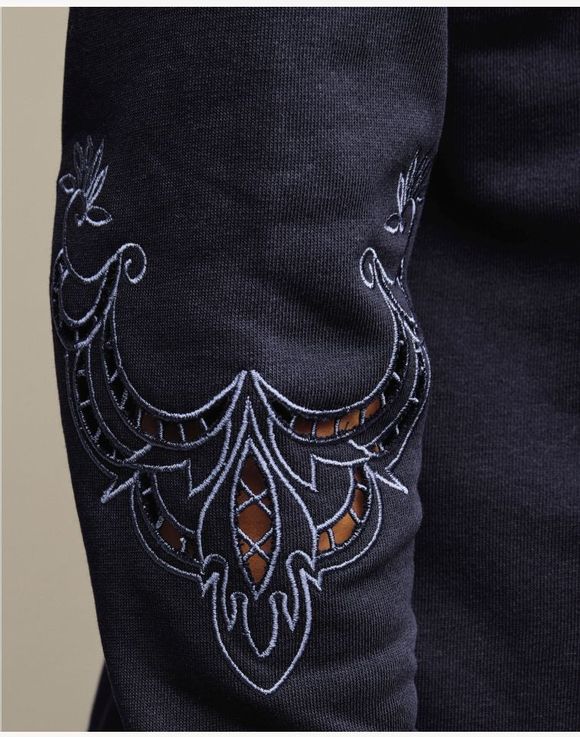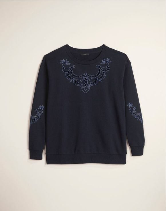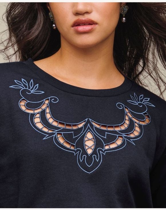 Open embroidery work and metallic accents add artisan-inspired detailing to a classic pullover. Chic navy top features a round neckline and ribbed cuffs and hem. Center back length: 25 1/2" on M; 27" on 1X. Imported.