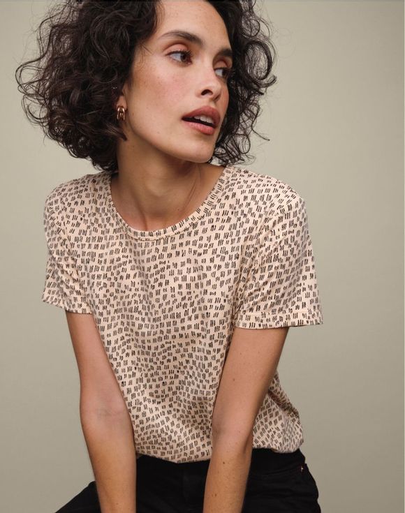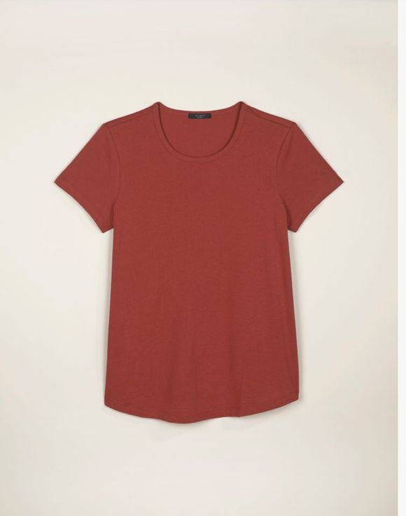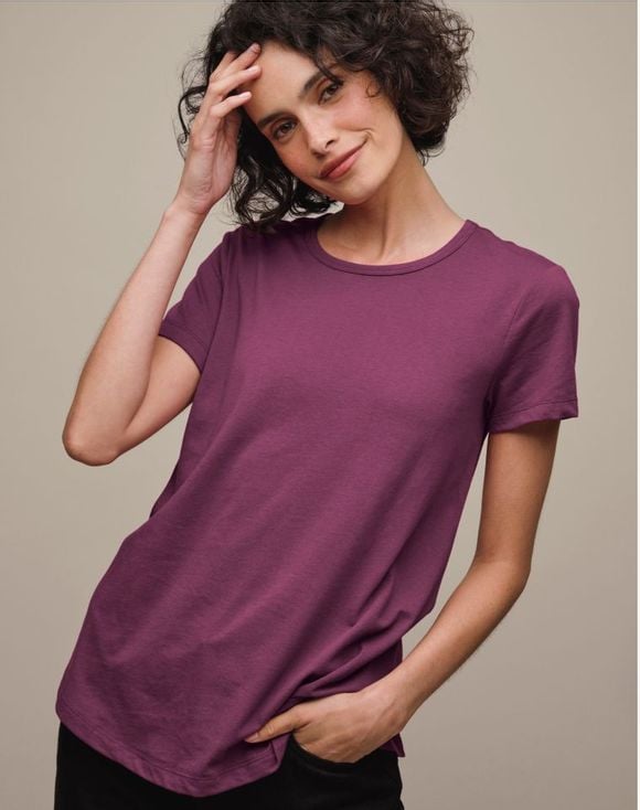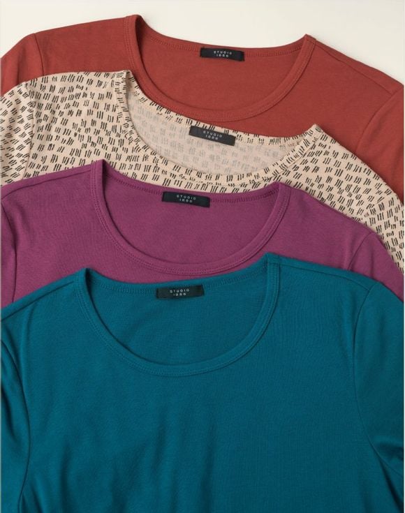 • Includes four tees in mushroom with black stroke print, chili red, plum/purple and deep blue