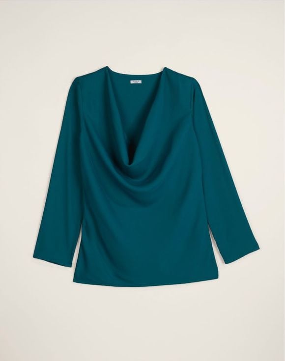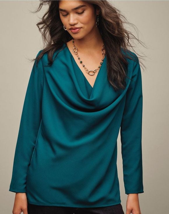 Get draped to perfection in a teal blue crêpe blouse with a cowl neckline, long sleeves and a relaxed silhouette. Perfect for pairing with a tailored skirt or skinny jeans–day or night. Center back length: 26" on M; 28" on 1X. Imported.