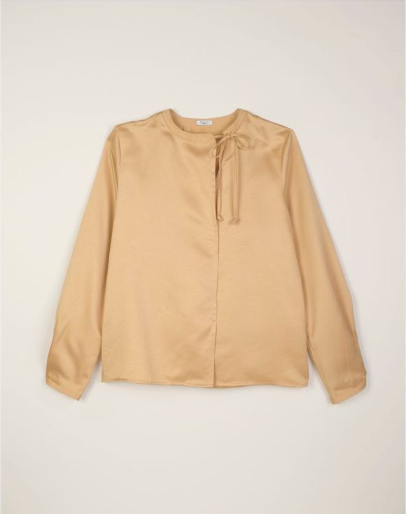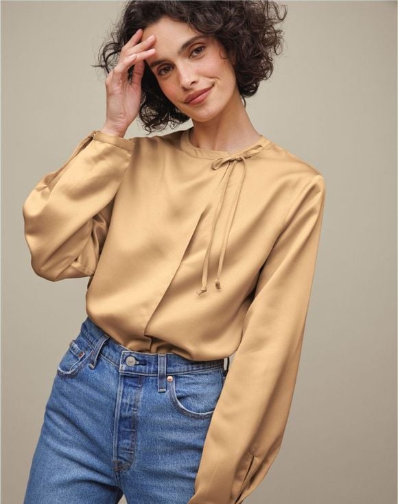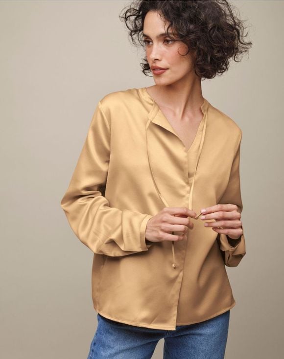 ailored from lustrous satin, this champagne-colored blouse with a fluid drape is effortlessly elegant. A graceful asymmetrical tie at the neckline can be worn knotted, tied or left undone for a relaxed open look. Features a band collar, front stitched pleat and long sleeves. Center back length: 25" on M; 27" on 1X. Imported.