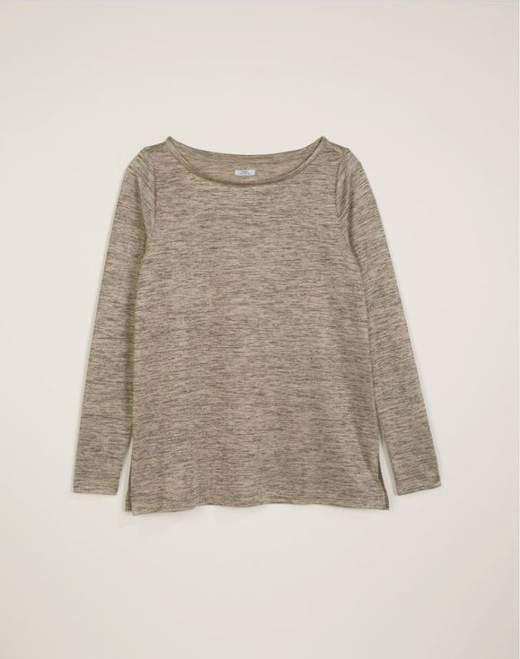 This variegated bronze metallic knit top turns a basic into something extra. The heathered finish adds visual interest, while the relaxed fit keeps your looks effortlessly chic. Features a scoop neckline, long sleeves and side slits. Center back length: 25 ½" on M; 27" on 1X. Imported.