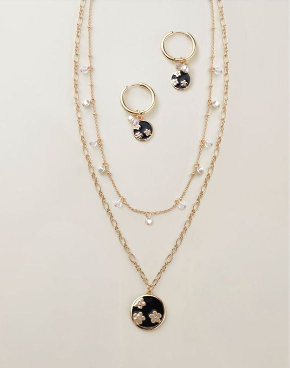 An elegant two-piece set that blends the depth of jet-black enamel with the warmth of golden floral accents. The layered chain necklace in glowing goldtone is comprised of a short chain with clear stones and pearly beads and a long chain with a floral-engraved disc pendant. Wear the two-in-one earrings as simple hoops or add the removable charms for a more sophisticated look. Imported.