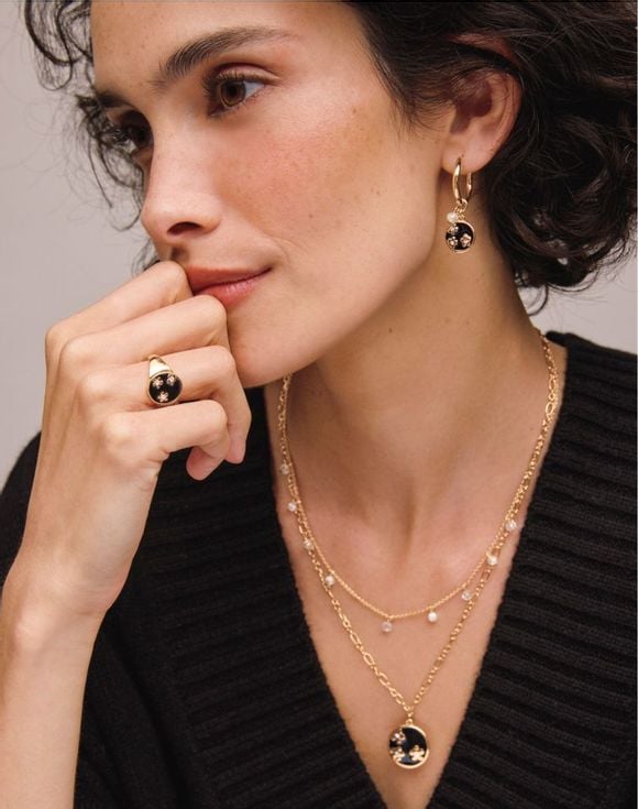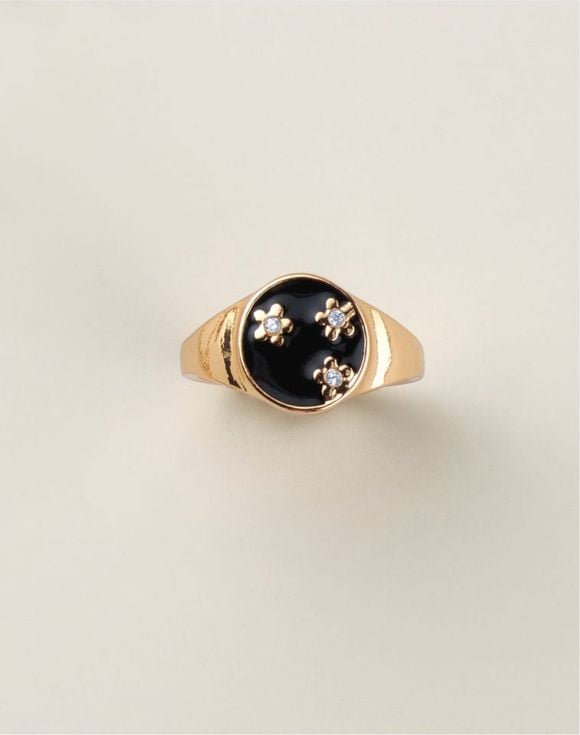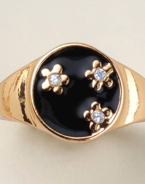 Channel old-world vibes with this black enamel ring with an ornate floral motif. Featuring jet-black enamel with golden floral accents, this ring represents bold style with botanical charm. Imported.
