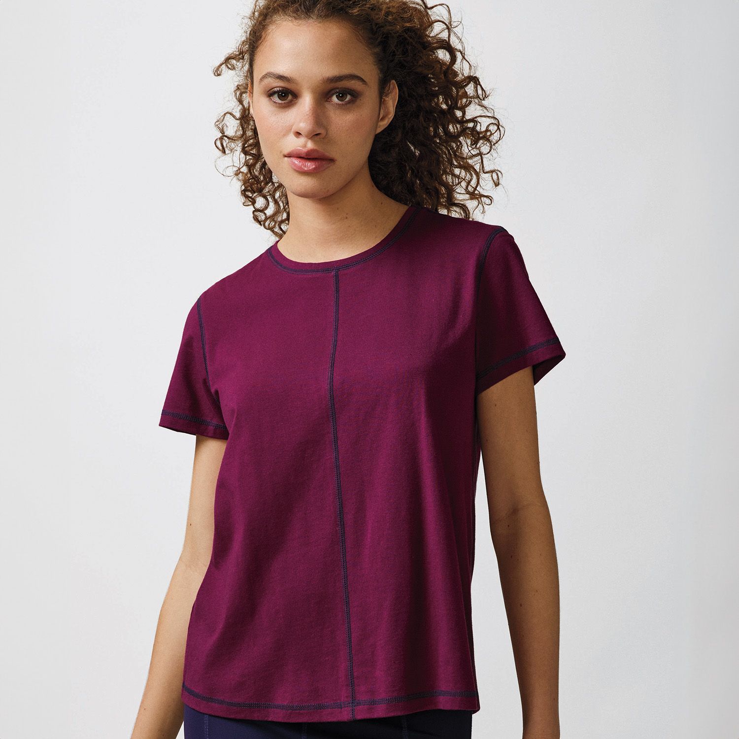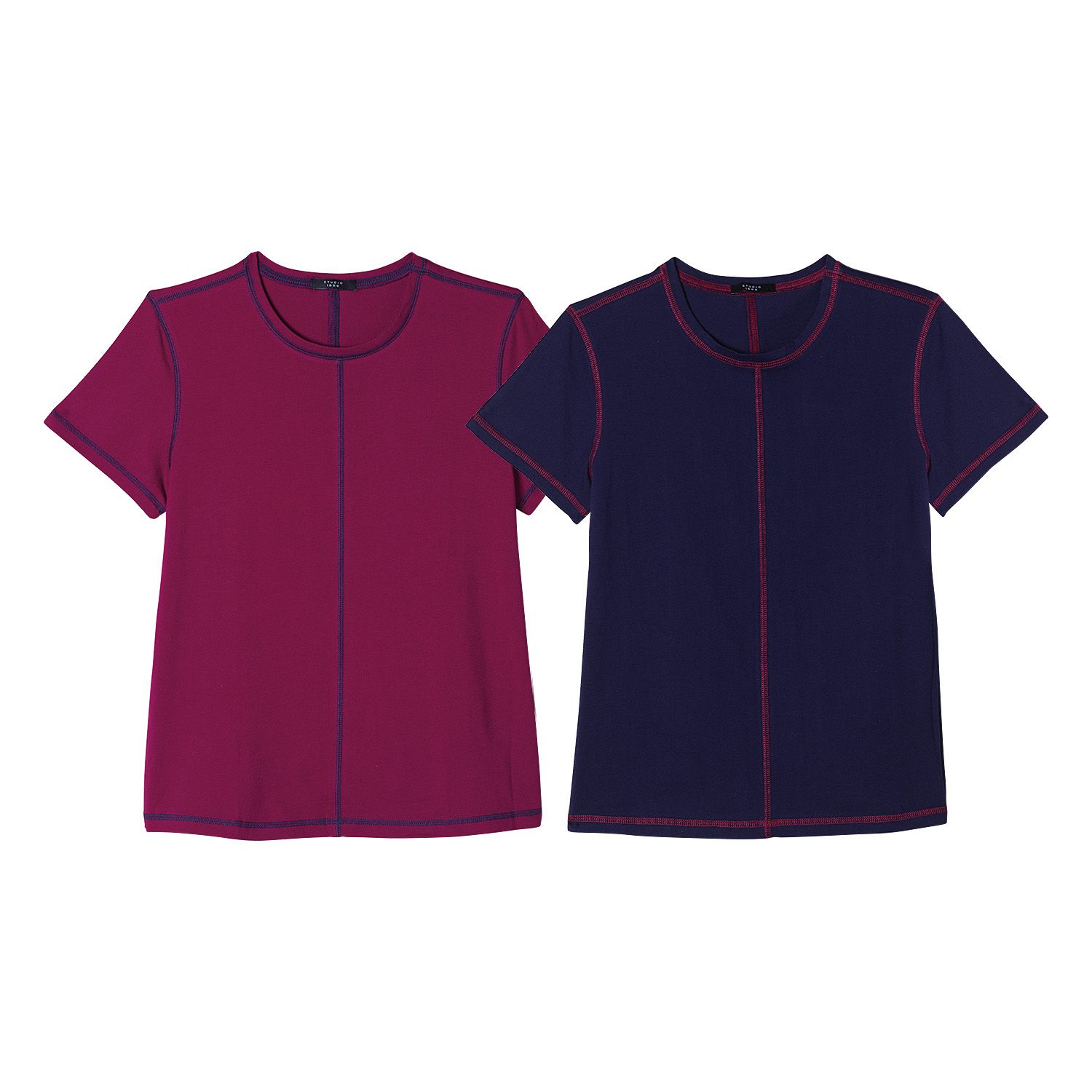 Double down on easy style with a set of two tops accented with a pop of contrasting-color detail on the seams. Includes navy top with purple stitching and purple top with navy stitching. Imported.