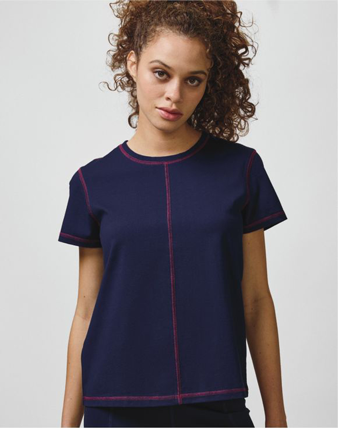 • Navy and purple tops with contrasting stitching