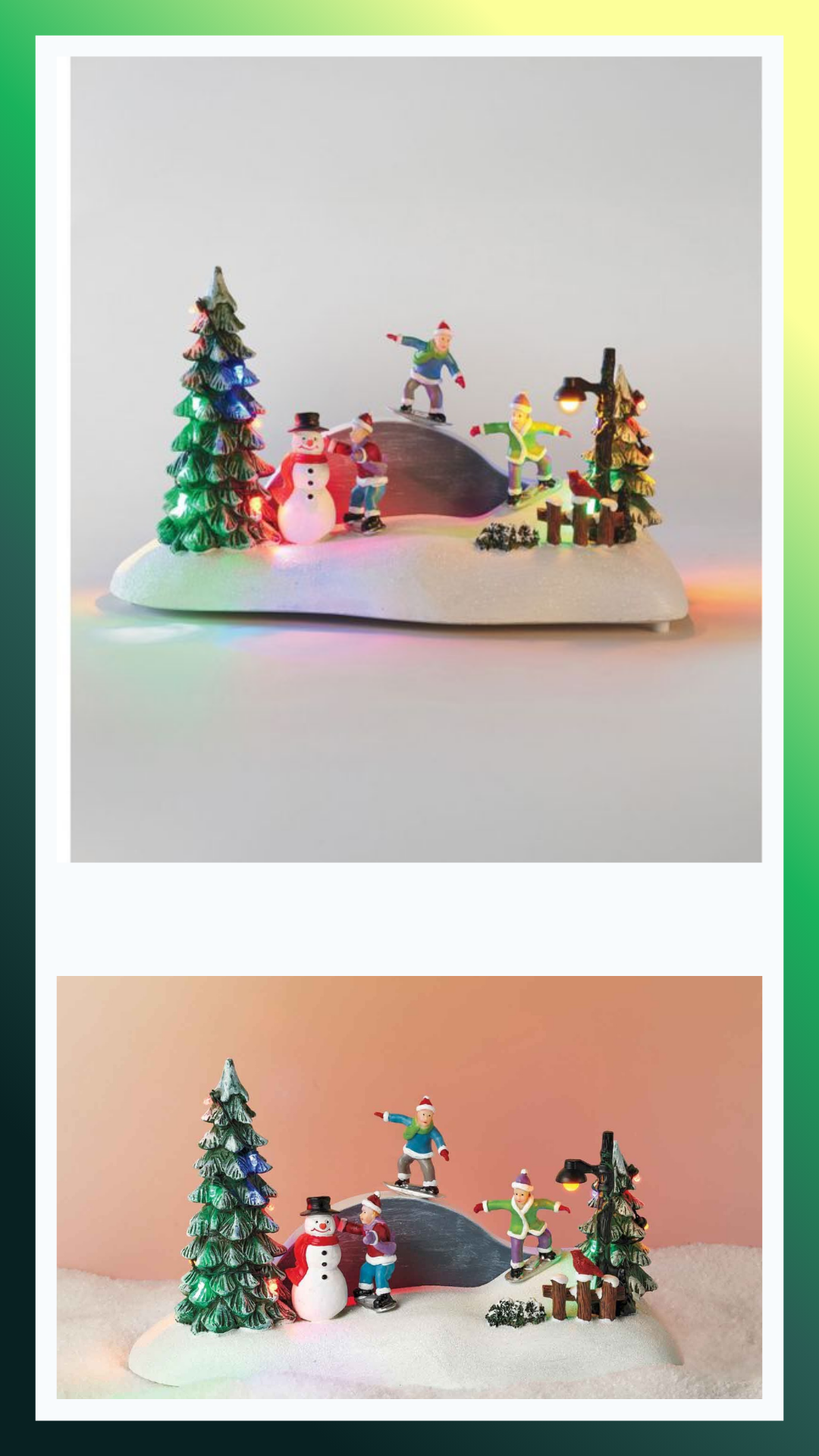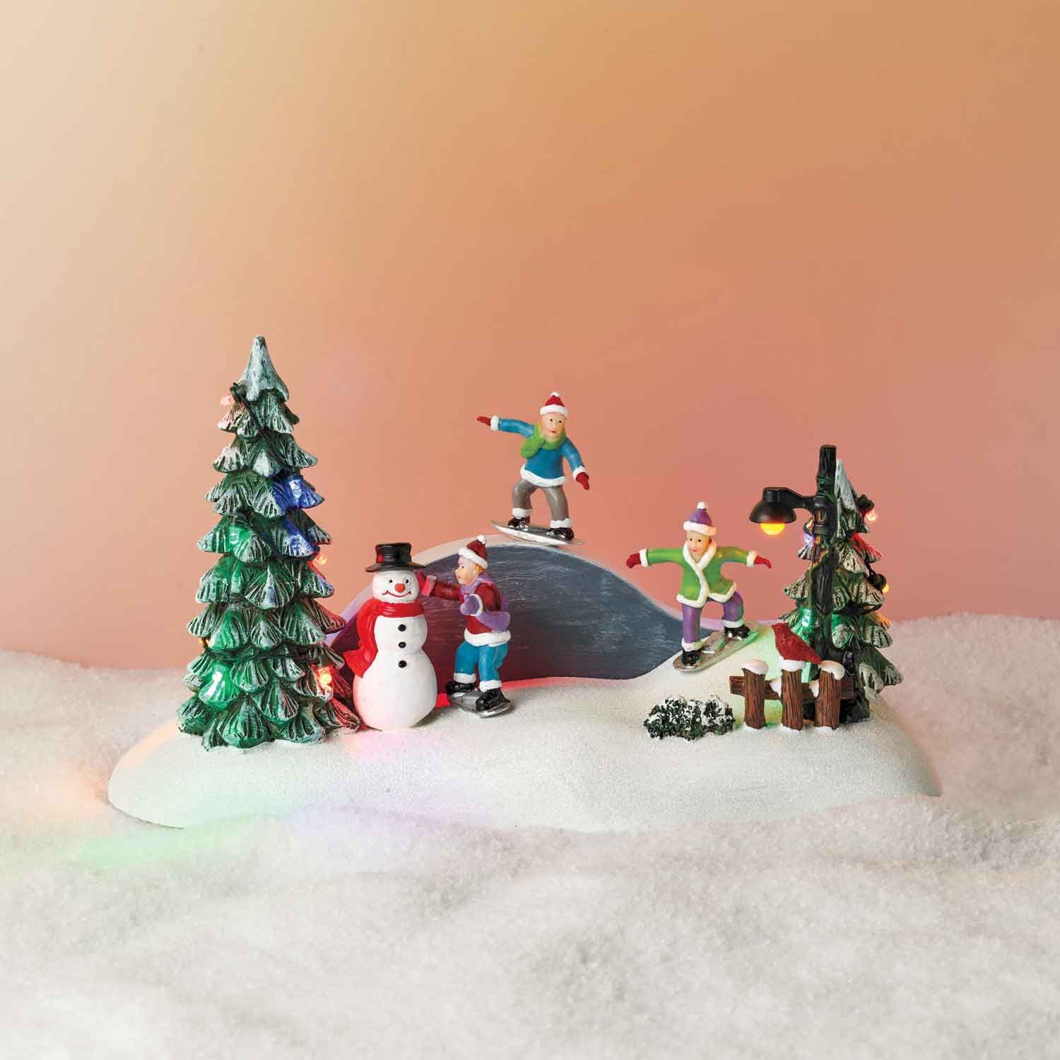 Let’s shred some powder! Our snowboarders ride down the slope and head back up for more thrills. Lights up and plays eight holiday tunes. Polyresin, plastic. 10 ⅞" L x 5 ⅜" D x 5 ⅞" H. Imported.