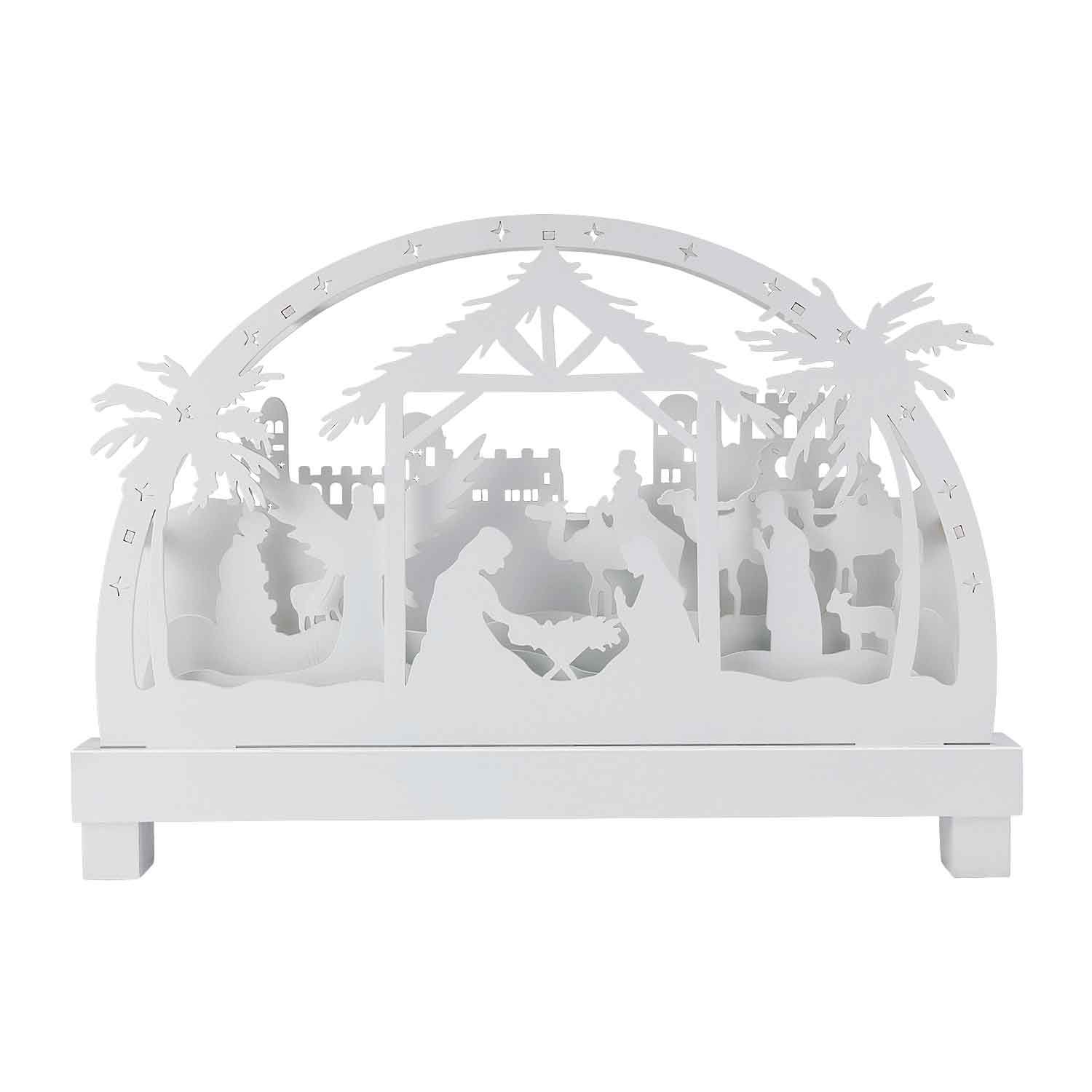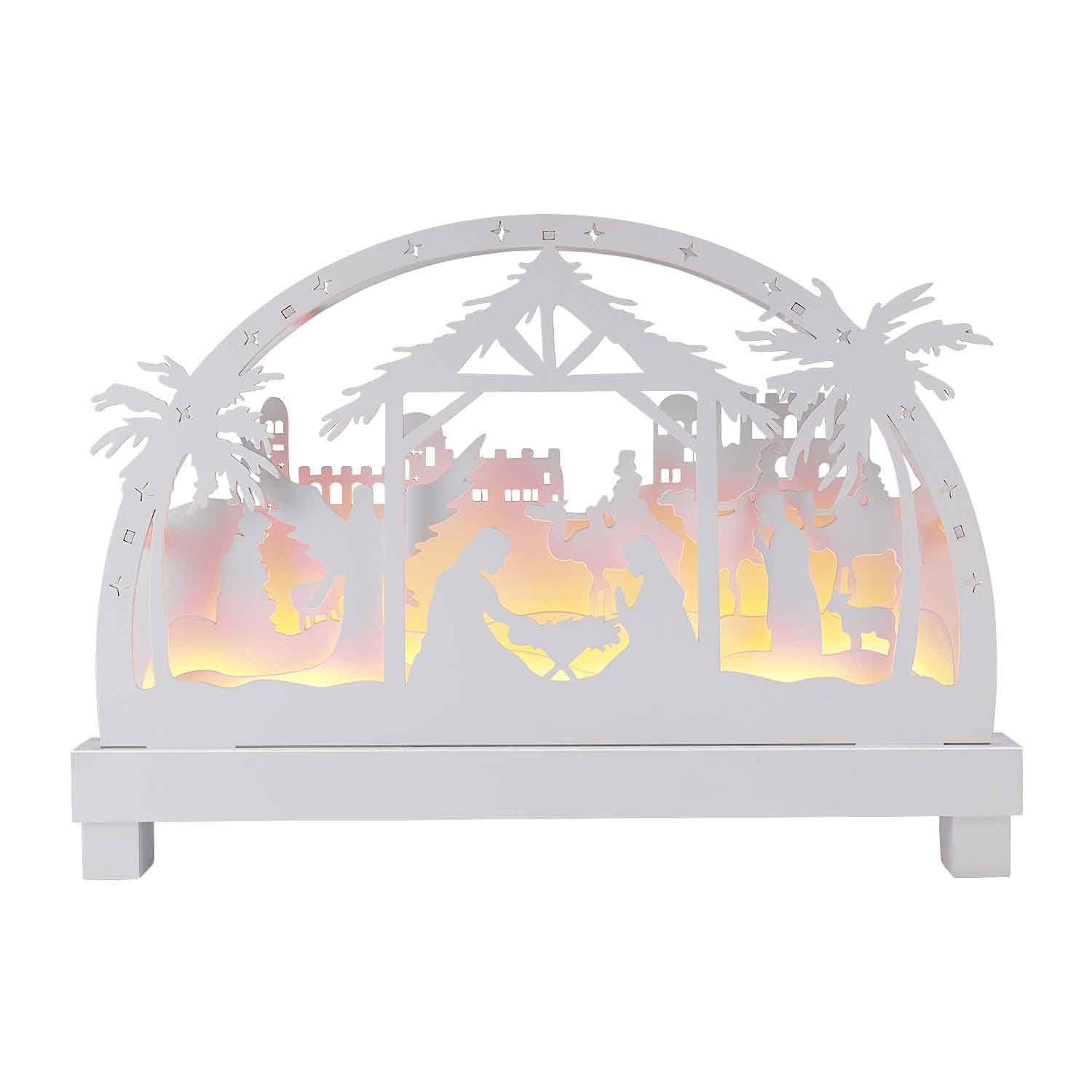 Sculpted nativity scene with back-lit filigree design creates a peaceful silhouette of the holy family. With warm white string lights. MDF. 13 ¼" L x 2" W x 8 ⅞" H. Imported.