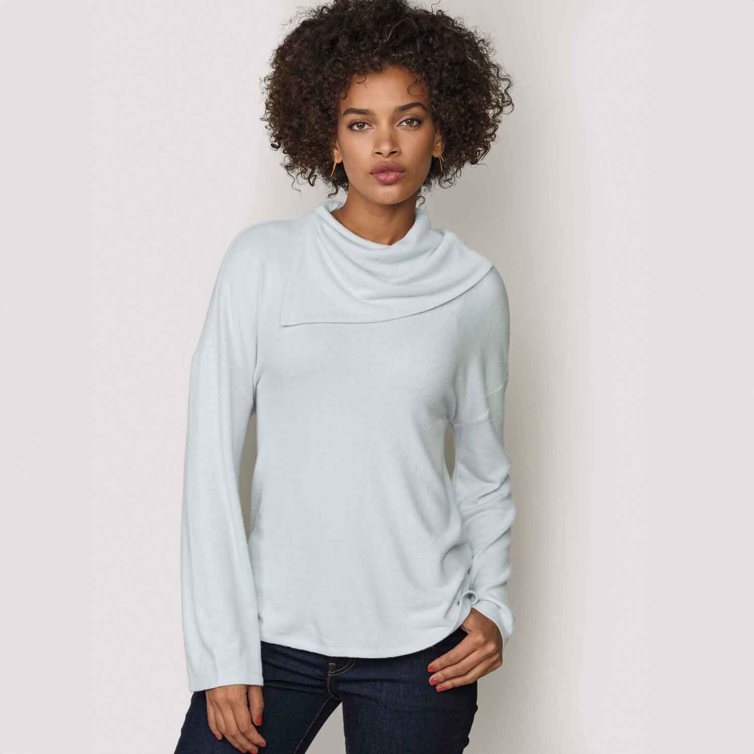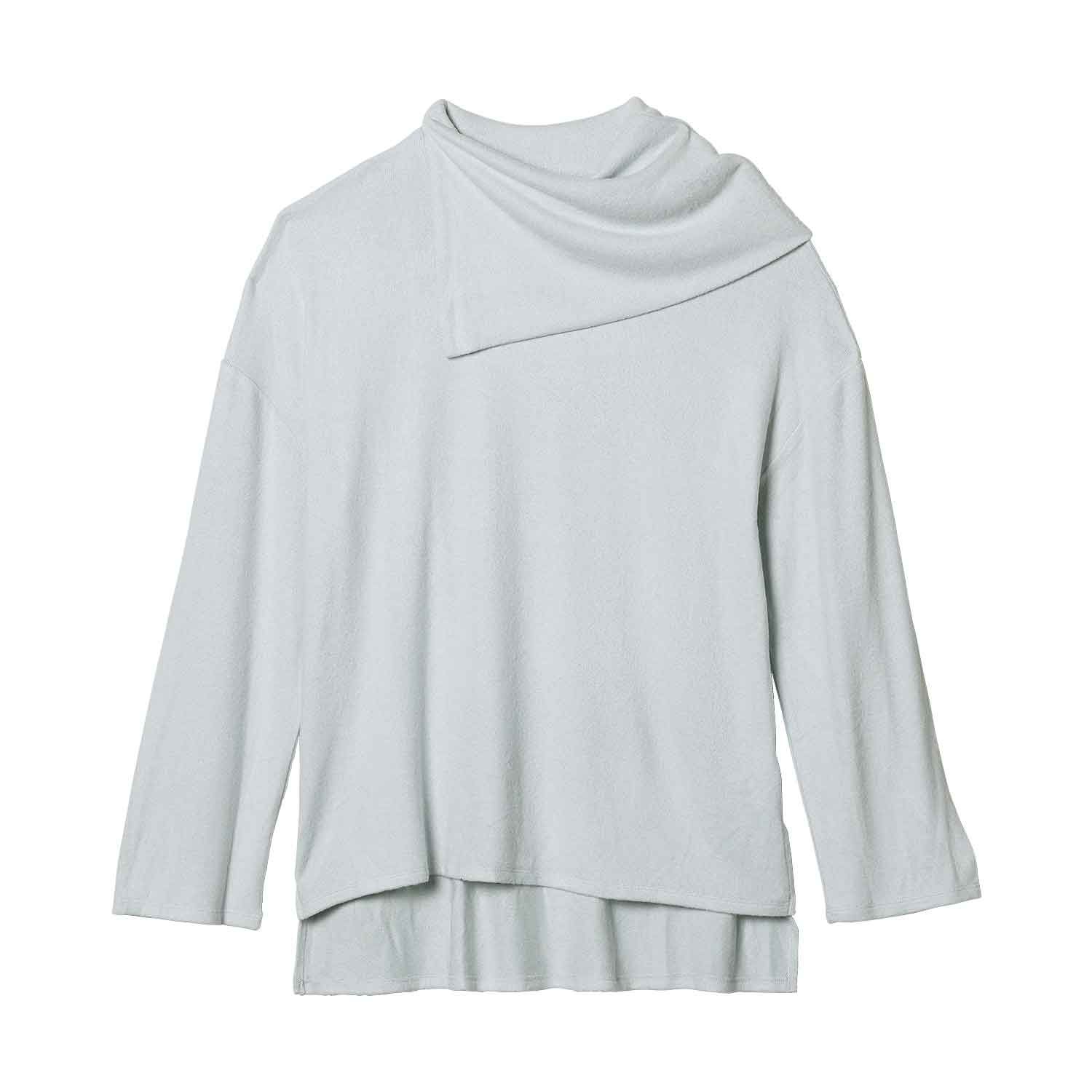 • Light gray soft-knit pullover with asymmetrical draped collar