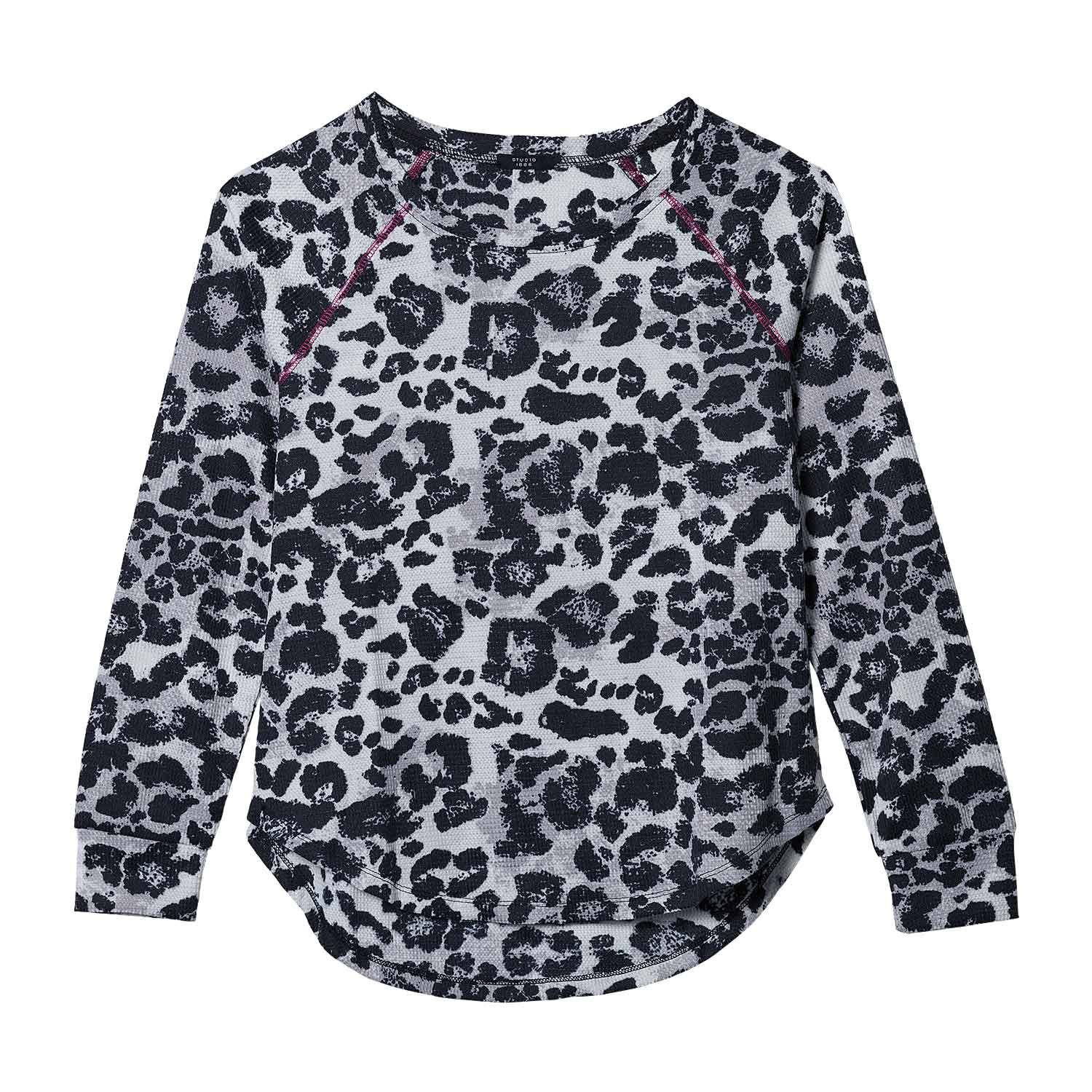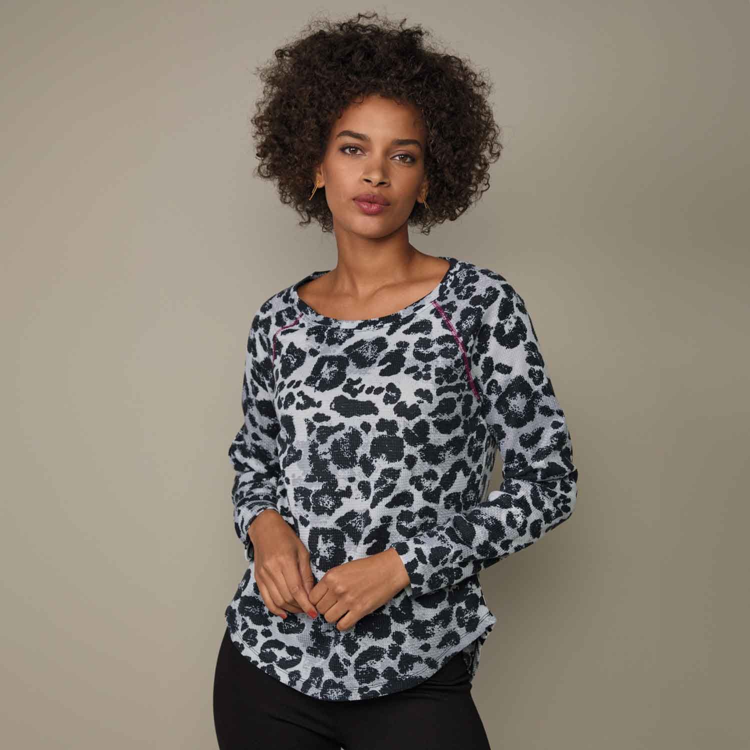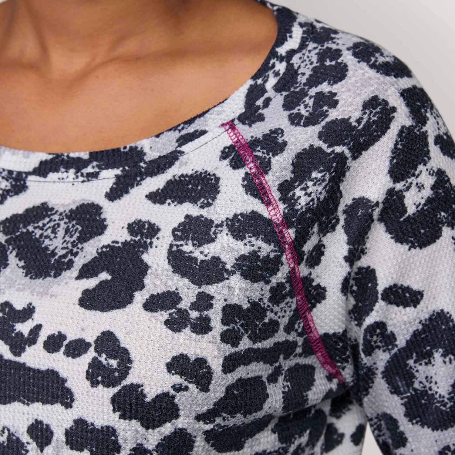 Look fierce and fabulous in this animal-print pullover top. Black and gray print on a soft waffle-texture knit is highlighted by magenta contrast-stitching detail on the raglan-style shoulders and finished with a high-low hem. Center back length: 25 1⁄2" on M; 27" on 1X. Imported.