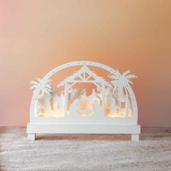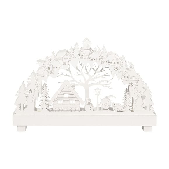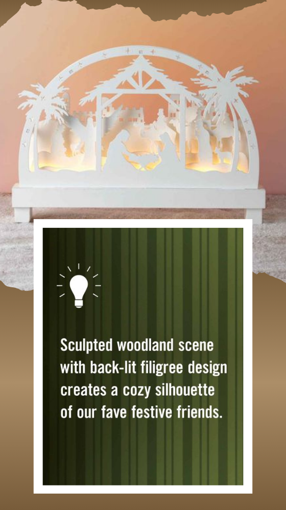 Perfect your cozy winter ambience with a sculpted woodland scene. Back-lit filigree design creates a soft silhouette of our fave festive friends. Neutral tones work with any décor theme. Wood, polyester. 13 ¼” L x 2” W x 8 ¾” H. Imported.