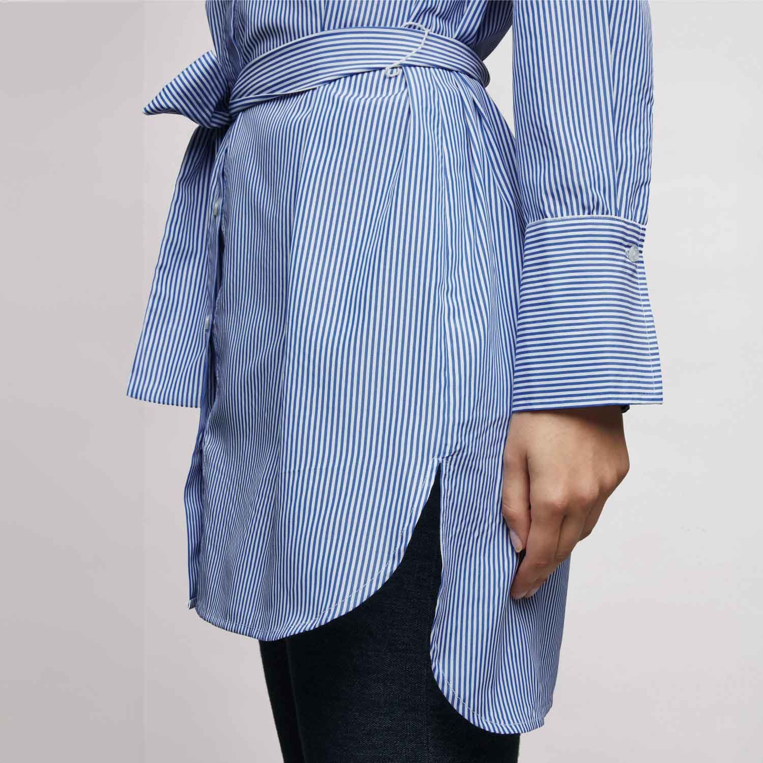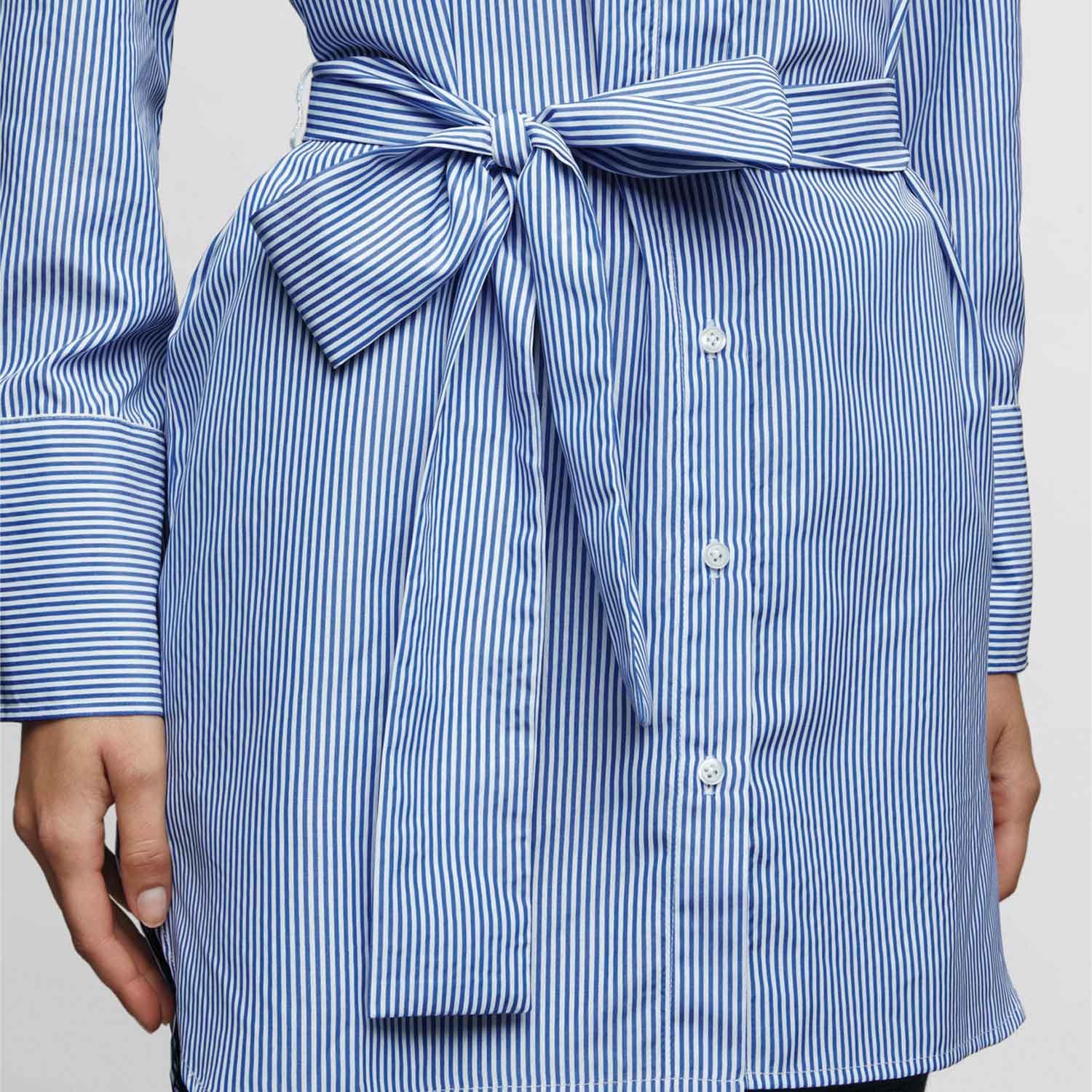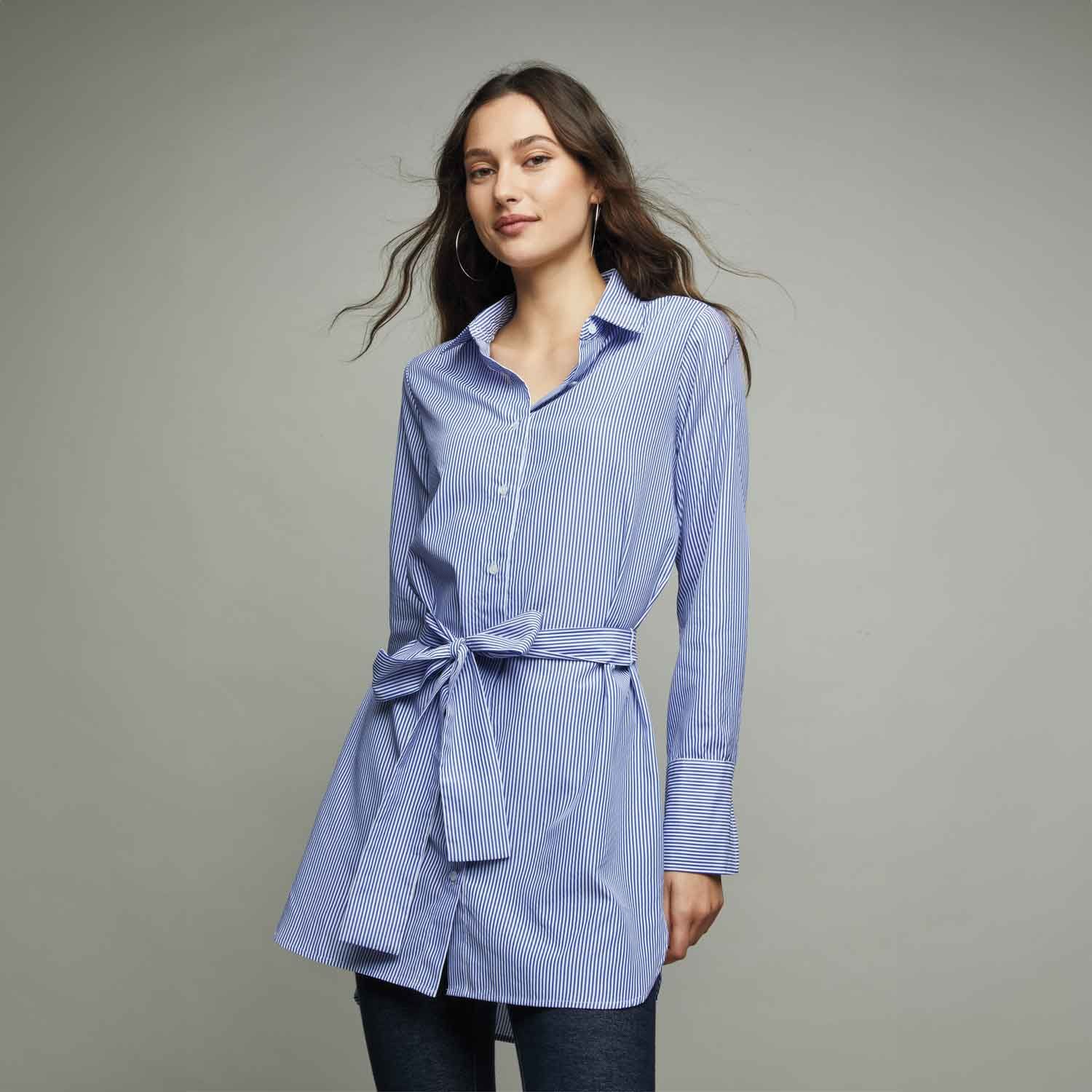 The boyfriend shirt gets a belt. A menswear-inspired top is modern yet wearable with its classic blue-and-white Oxford stripe pattern and wide cuffs. This workweek staple features a pointed collar, button-front placket and waist-cinching fabric self-tie belt. Center back length: 36" on M; 37" on 1X. Imported.