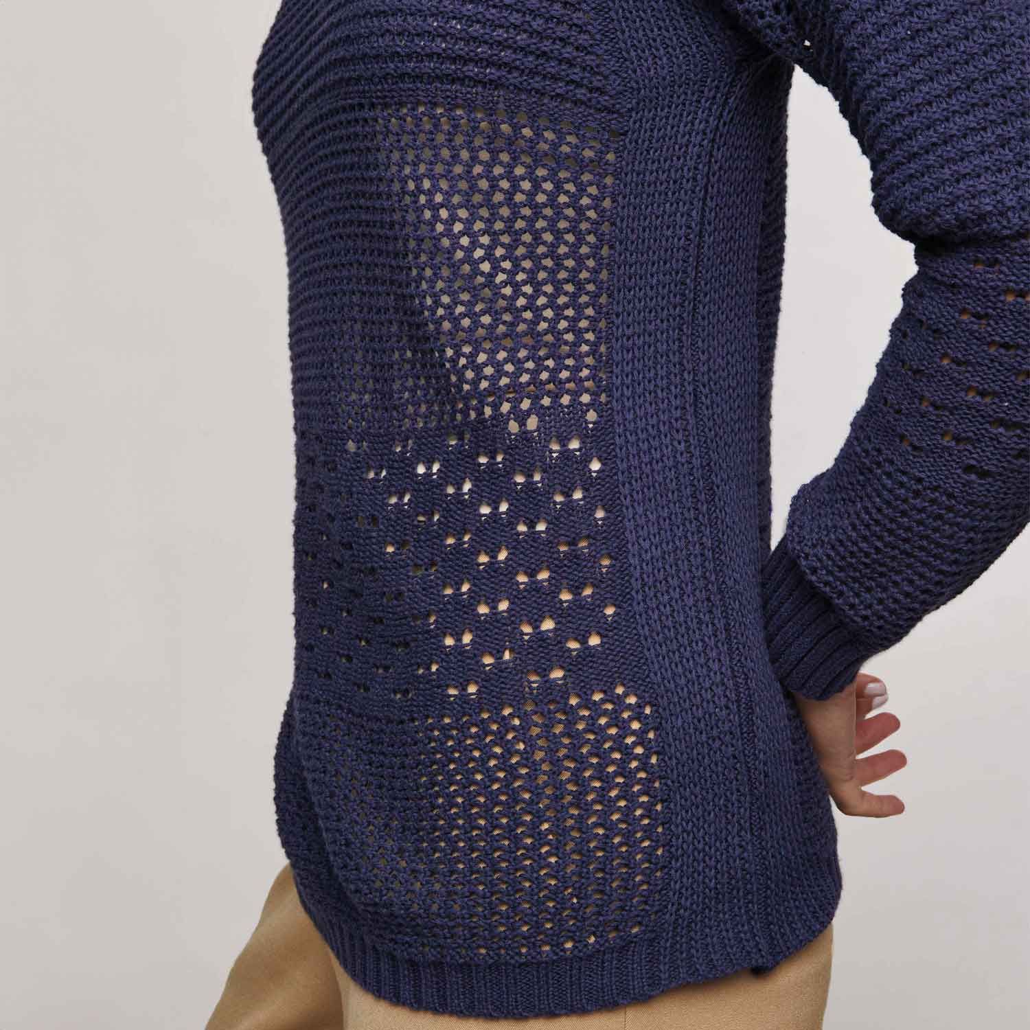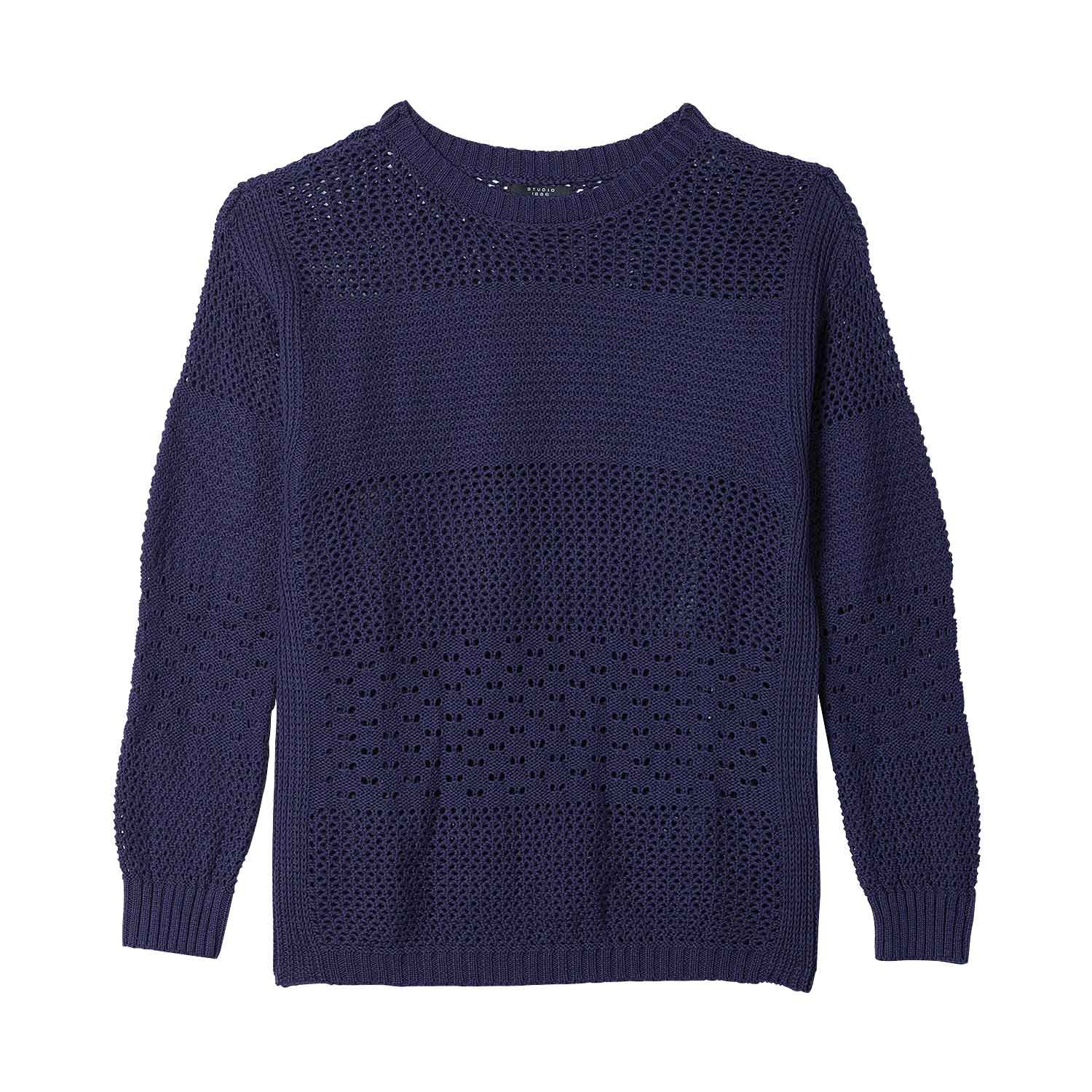 The perfect wear-everywhere staple, this full-of-texture mixed open-knit sweater in sophisticated navy is versatile enough to be worn with everything from khaki pants to denim shorts. A lightweight multi-pattern knit is detailed with a round neckline and long sleeves. Center back length: 23" on M; 26" on 1X. Imported.